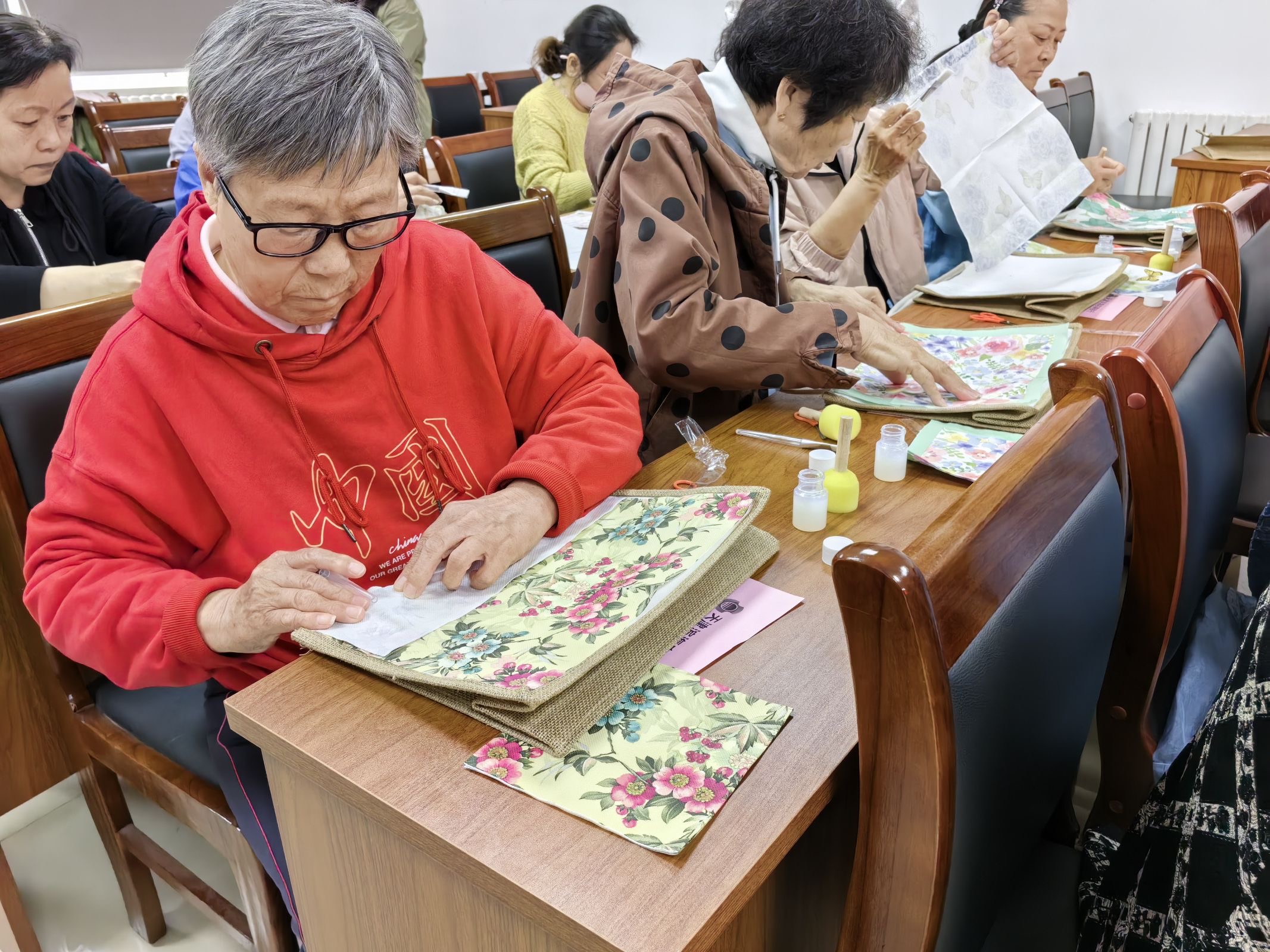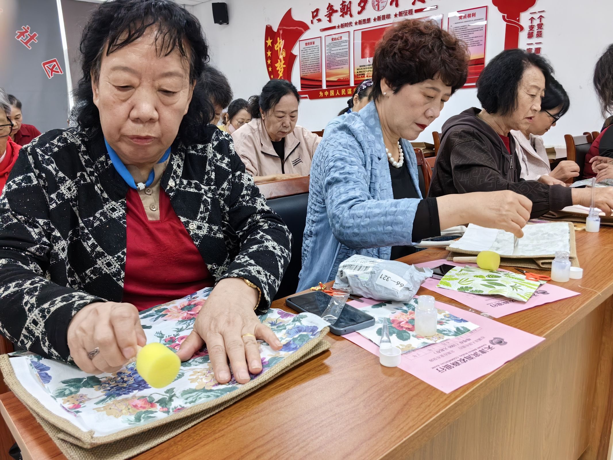 在温馨的氛围中,手工制包环节正式开始。社区网格员将色彩缤纷、花样繁多的制包材料一一分发到阿姨们手中,阿姨们兴致勃勃地挑选着自己喜爱的花色。随后,家长学校李老师走上前,从布料剪裁、针法选择,到包型塑造、装饰点缀,细致入微地讲解整个制包流程的步骤与注意事项。阿姨们认真聆听,在掌握技巧后,便迫不及待地投入到紧张而有趣的制作过程中。现场气氛热烈,欢声笑语不断,大家一边手法翻飞,一边交流心得,一块块普通的布料在她们的巧手下,逐渐变成了独具匠心的精美手提包。一个个鲜艳的手提包凝聚着阿姨们对美好生活的热爱。