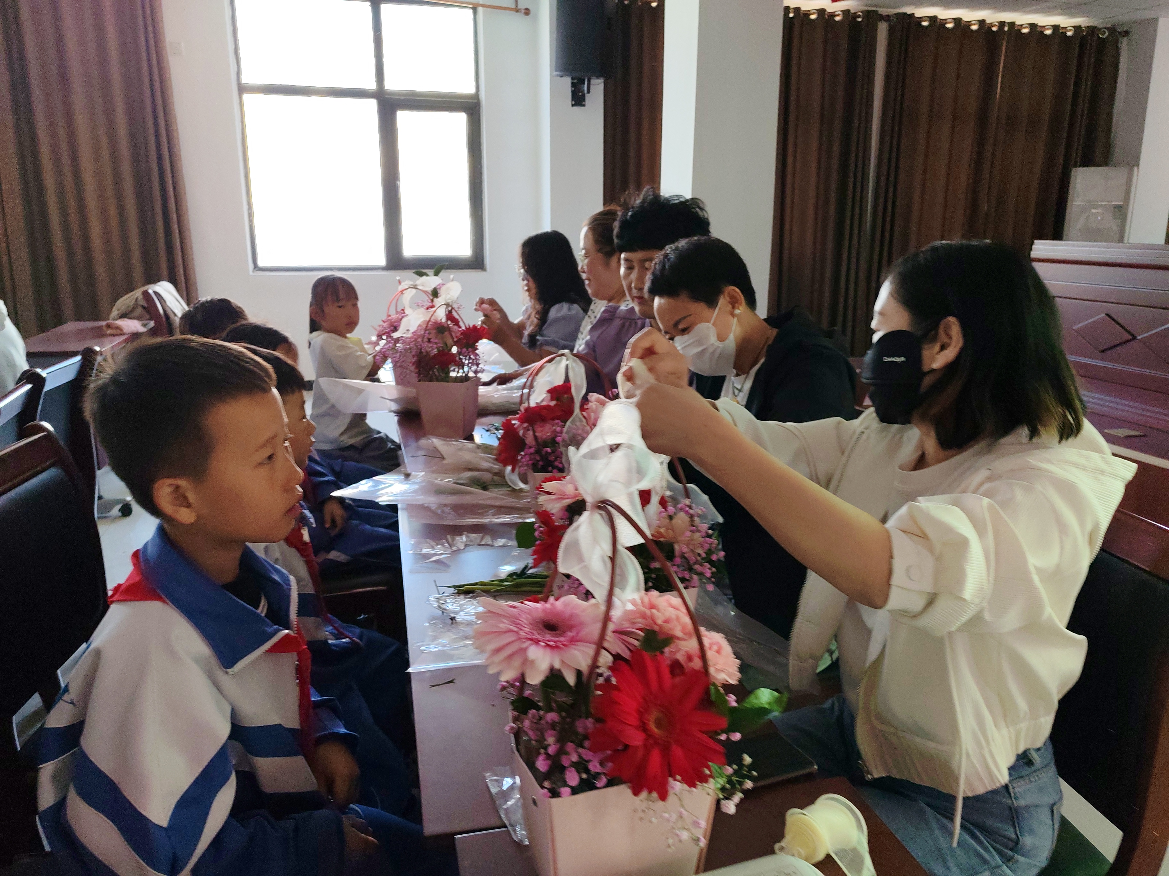活动现场,花香四溢,向日葵、康乃馨、玫瑰等鲜花摆满了桌子。村委会工作人员为村民讲解了插花的基本技巧和色彩搭配,大家听得认真,学得仔细。孩子们也在家长的引导下,小心翼翼地修剪花枝、搭配颜色、设计造型,稚嫩的脸庞满是专注。“妈妈,这朵向日葵送给你,祝你永远像太阳一样温暖!”不少孩子将亲手制作的花束献给母亲,现场温情四溢。