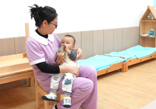 “托育服务不同于幼儿园托班。后者以集体教育为主,而托育更侧重日常照护,服务标准更高、难度更大。孩子们多数还不会表达,我们要学会读懂他们的‘婴语’。像豆豆这样刚脱离完全依赖期的宝宝,喂饭时得频繁蹲下观察咀嚼状态。”毕业于学前教育专业的吕莹老师已在这一行深耕三年,对她们来说,每天频繁的蹲起早已成为“职业姿态”,每个细微动作都传递着专业与关爱。