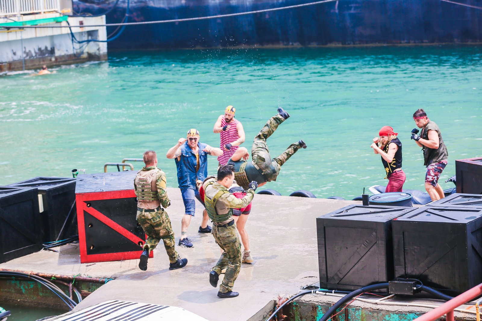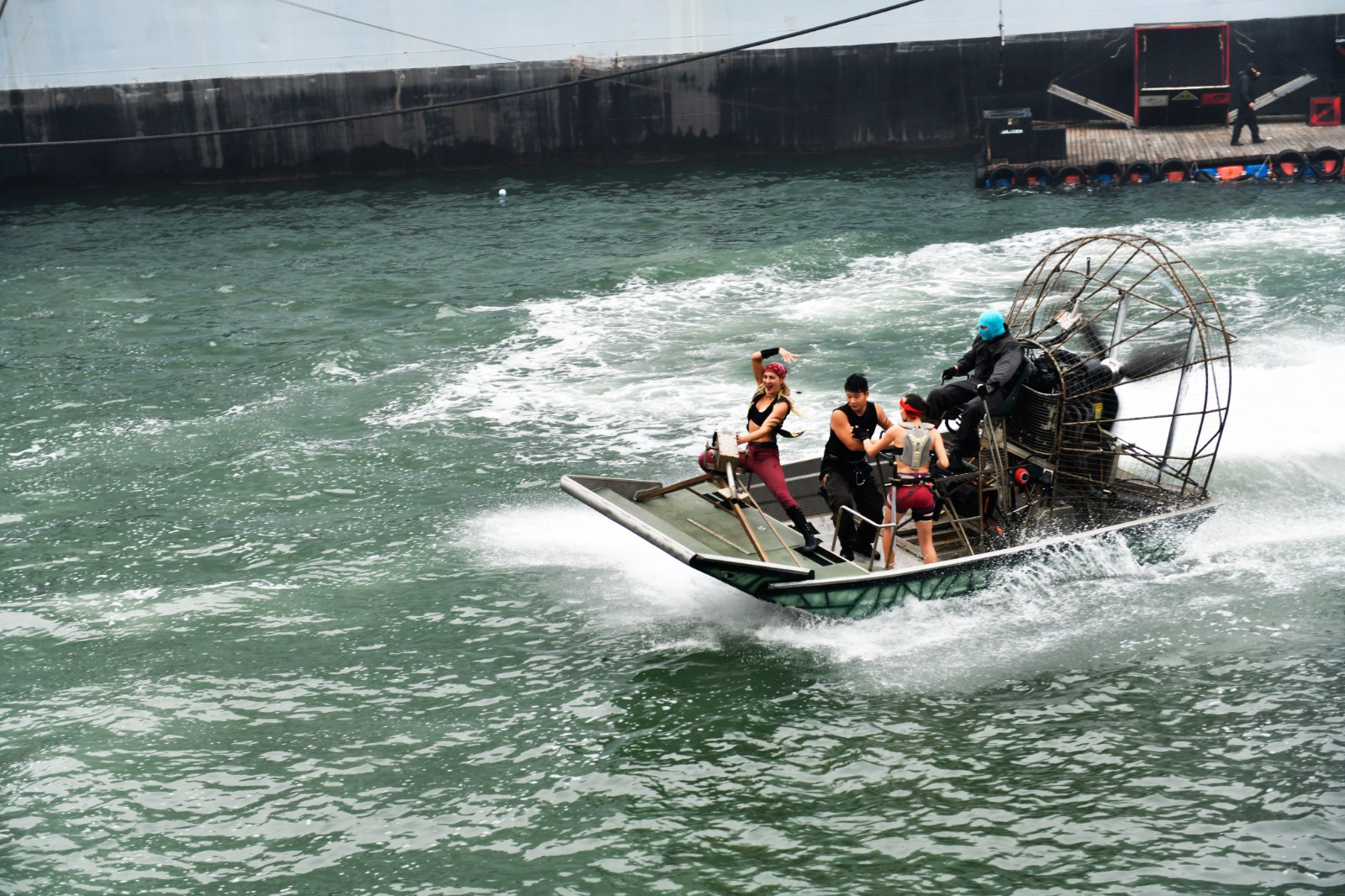 与硬核军事文化形成张力碰撞的,是航母公园两大王牌特技秀——大型实景海战表演《航母风暴》与《飞车特技》演出。其中,《航母风暴》借助风扇机船、水上飞行器等高科技装备,通过高空跳水、火海穿越等高危特技还原真实海战场景;《飞车特技》中,改装战车的漂移甩尾与两轮侧行伴随着轮胎火星四溅,将观众的观看激情推向高潮。