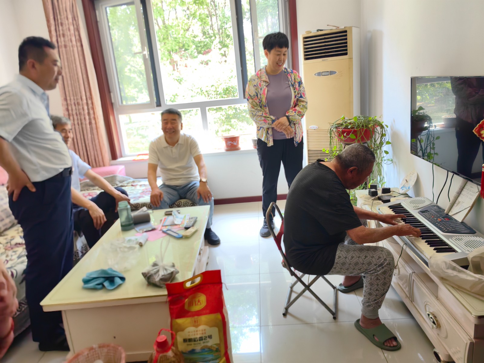 粽子包好后,村志愿者与共建单位的工作人员一同入户将粽子送到村80岁以上的高龄老人手中,滨海农商行小王庄支行也特别准备了慰问品并送上节日祝福。走访过程中,95周岁的姚爷爷非常有兴致地为大家弹奏了一曲。