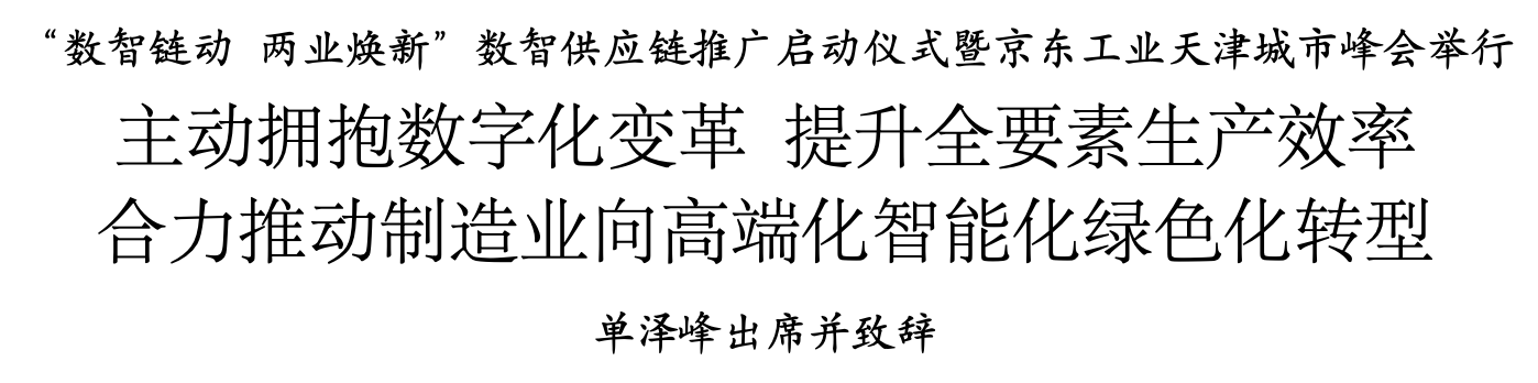 单泽峰在致辞中表示,近年来,在习近平总书记掌舵领航下,在市委、市政府坚强领导和市级部门指导帮助下,滨海新区一体布局通用算力、智能算力、超级算力,推动互联网、云计算等新兴技术在研发设计、生产制造、管理服务等环节广泛应用。当前,滨海新区正在深入贯彻落实习近平总书记视察天津重要讲话精神,加快特色数字产业聚集区建设,切实把数智产业潜能转化为高质量发展动能。真诚期待广大企业主动拥抱数字化变革,借助京东工业的技术优势,实现企业盈利能力的明显提升。同时,热切盼望京东集团继续把滨海新区作为重要合作伙伴,将更多好产品、好项目部署到这片开发开放的热土,共同谱写京津冀协同发展新十年的壮美篇章。