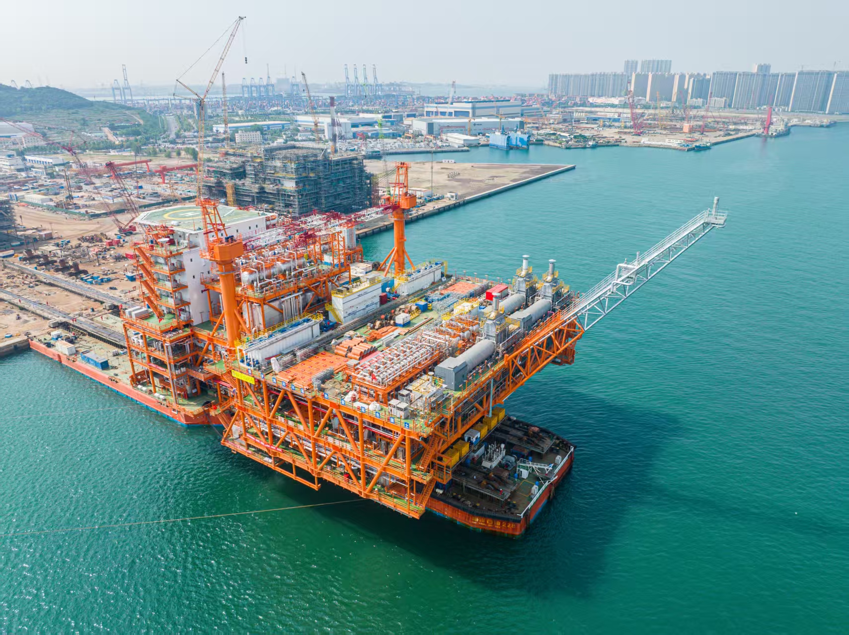 本次装船的垦利10-2中心处理平台设计重量超2万吨,是渤海海域重量最重、外形尺寸最大的海上油气平台,采用5万吨级拉力千斤顶牵引装船系统,牵引距离超过200米,平均装船速度达25米/小时,效率较国外同类设备提升约60%。