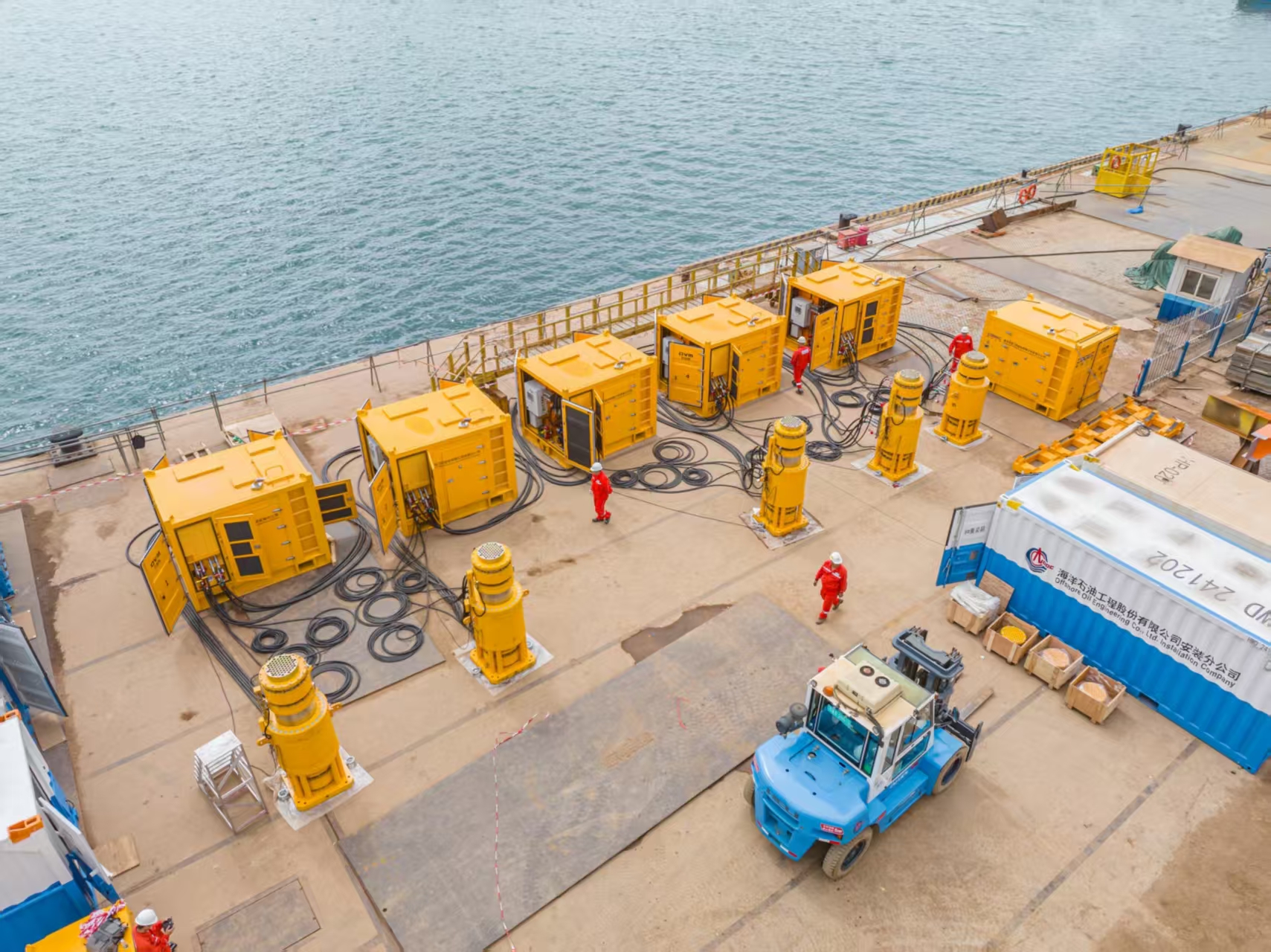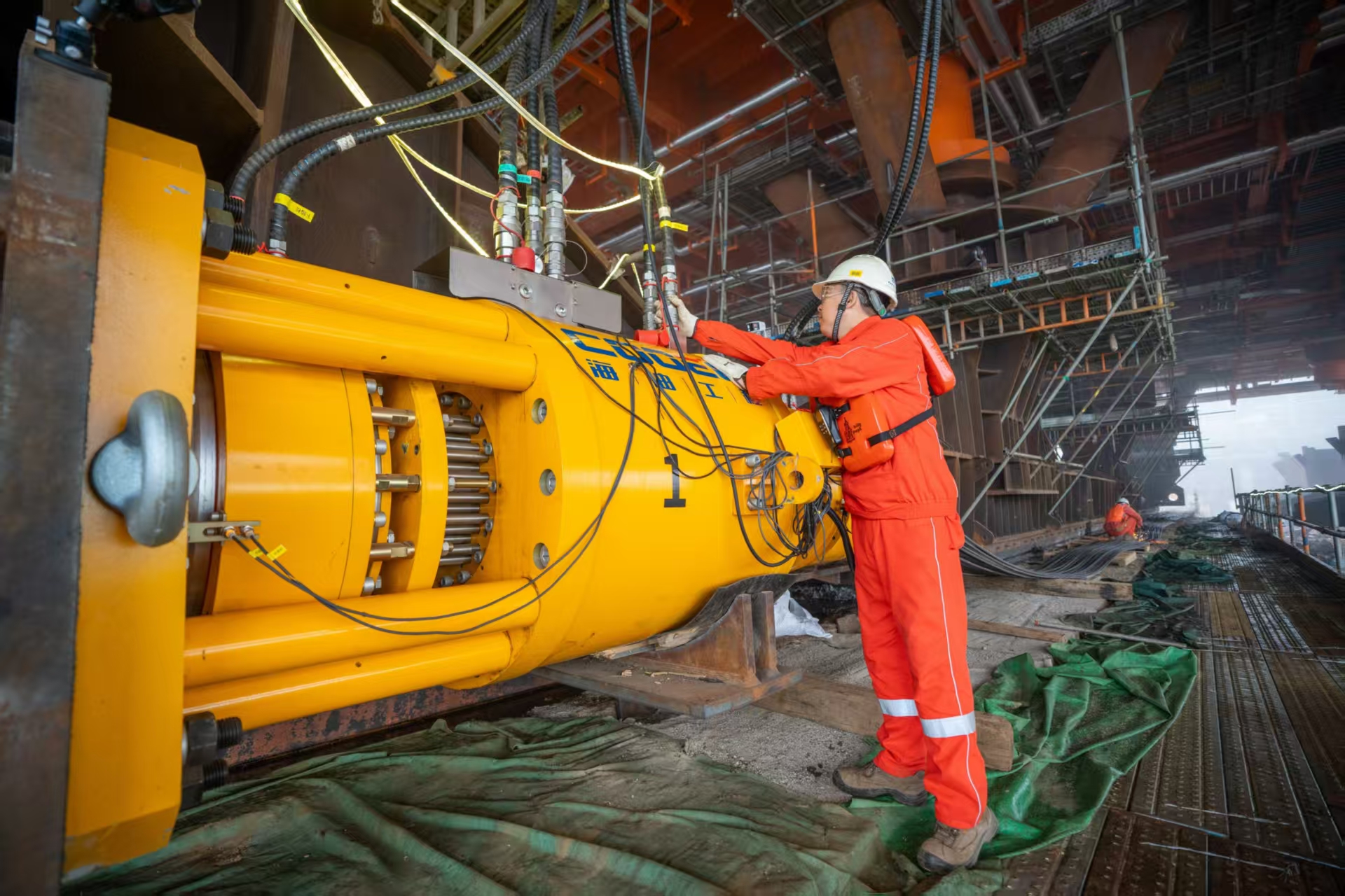 据海油工程拉力千斤顶牵引装船系统负责人宋晓修介绍,5万吨级拉力千斤顶牵引装船系统由海油工程联合柳州欧维姆机械股份有限公司自主研发,主要包括10台1000吨拉力千斤顶、4台1000吨助推千斤顶、动力站、控制系统和固定锚点,关键部件全部实现国产化,最大牵引重量可达5万吨,相较于常规装船设备,其作业安全性能、运维效率和节能降耗等方面成效显著,大幅提升我国海洋油气平台安装能力。