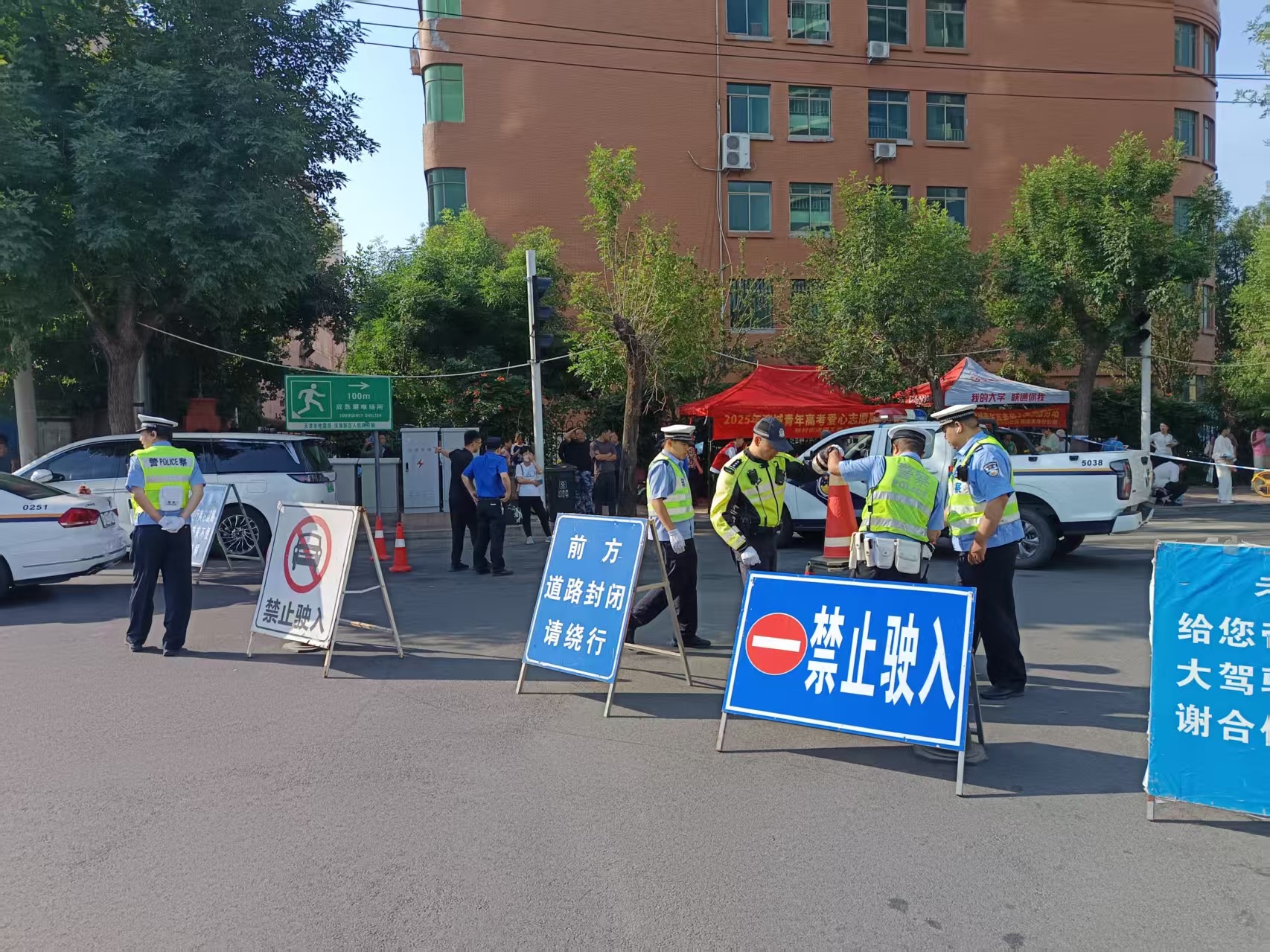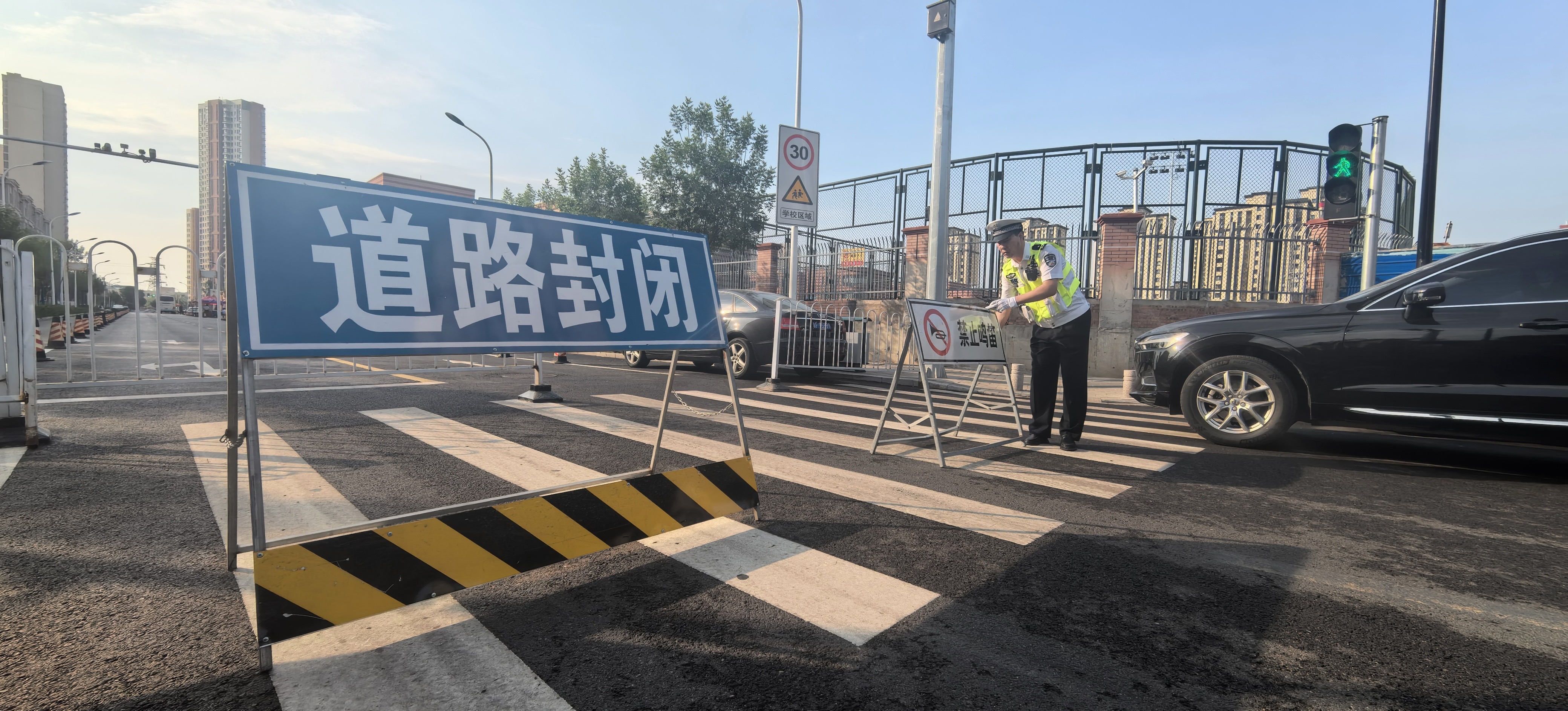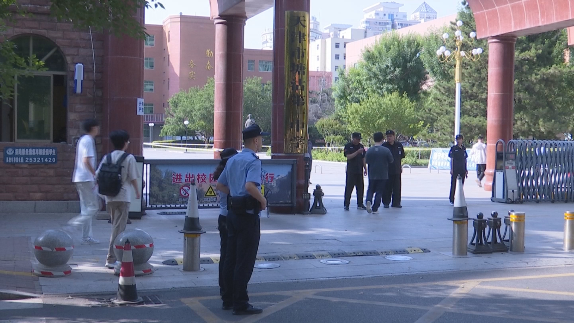 为给考生营造安全、安心的考试环境,各相关部门通力协作,为考生倾力护航。天津经济技术开发区第一中学(广达校区)是今年的新增考点,考点所在泰达街道结合考点周边实际情况,联合多部门保障高考顺利进行。滨海新区泰达街道办事处主任张明说:“这是经开区第一次设置高考考点。泰达街道联合交管、公安、城管、社区等部门,保障周边的秩序和环境。考点旁的小区天和轩,正对考点的门已经是封闭的状态了,居民都是从两侧通行,以保障考点秩序。”