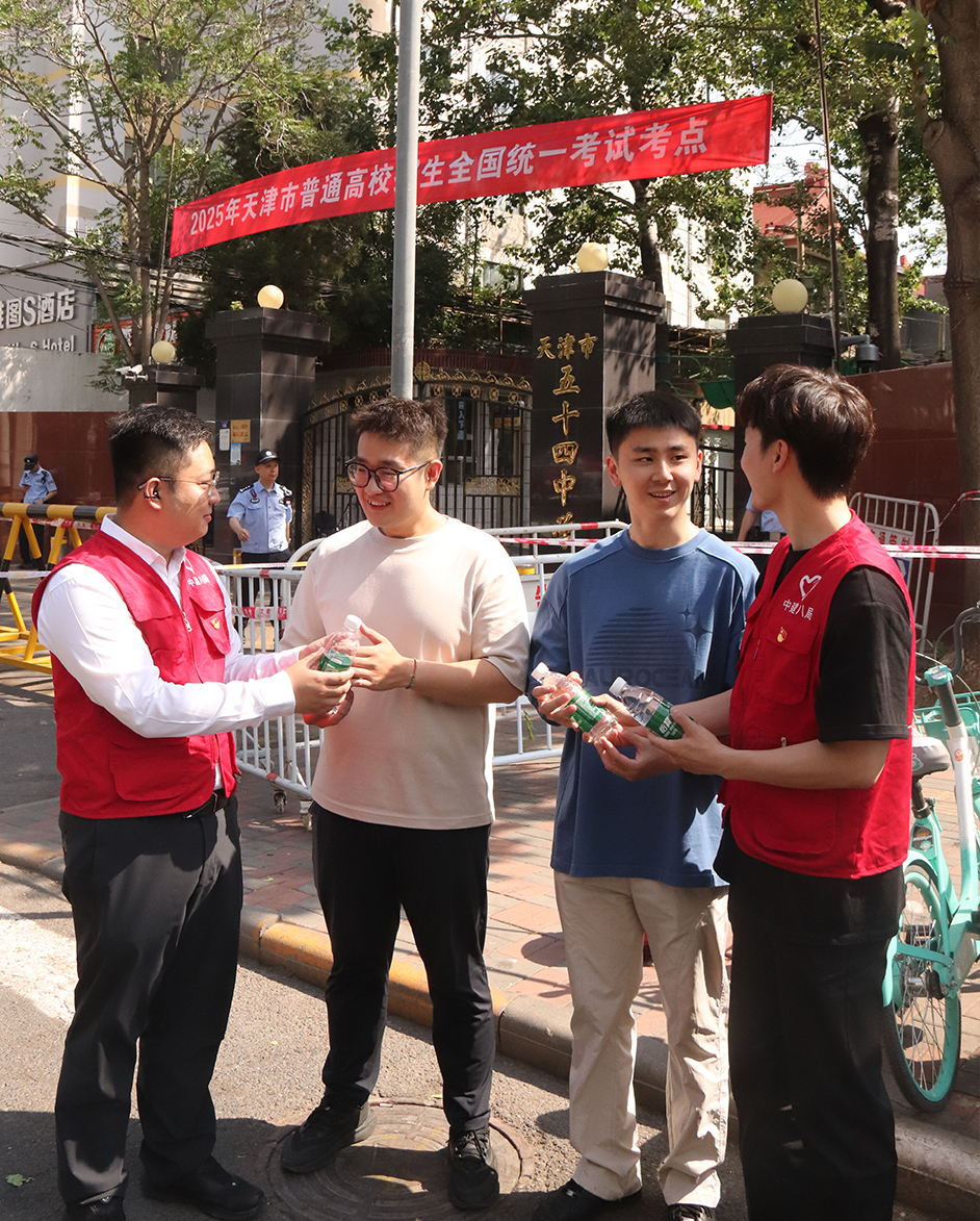 中建八局华北公司“十典九章”青年志愿者服务队与新村街道团工委携手合作,在天津市塘沽第一中学考点设立爱心服务站,精心筹备各项服务,为高考学子和陪考家长送上贴心关怀。