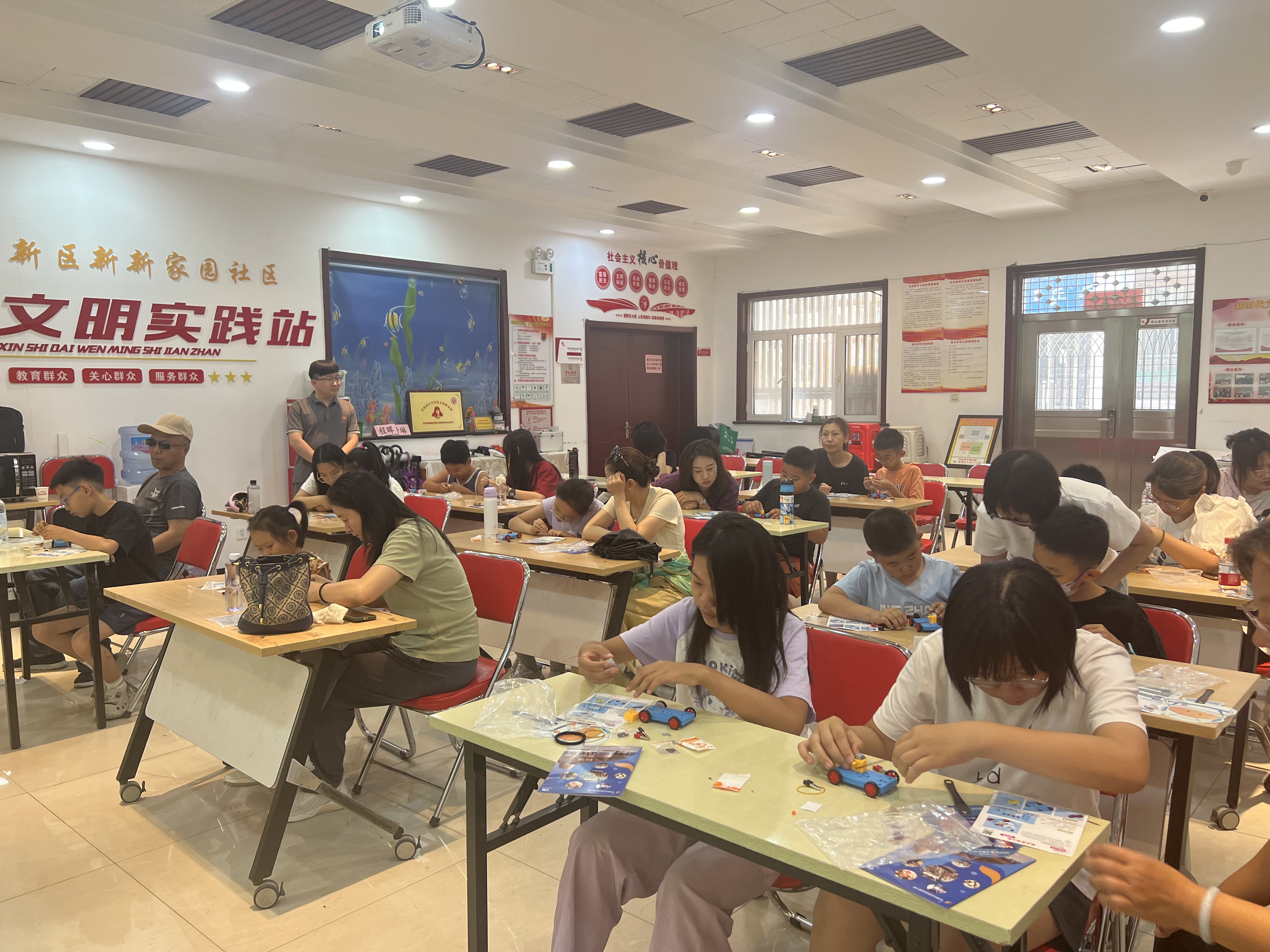 活动中,工作人员拿出铜片、锌片和一杯盐水,向大家展示如何制作盐水发电小车。在工作人员的帮助下,孩子们也立即动手制作起来。他们相互协作,遇到不懂的地方就向工作人员或家长求助,不一会儿,一辆辆小车就制作完成。当小车动起的瞬间,孩子们发出阵阵惊呼。随后老师详细解释了盐水电池的工作原理,即盐水作为电解质溶液,铜片和锌片作为电极,通过化学反应产生电流,从而产生动力。