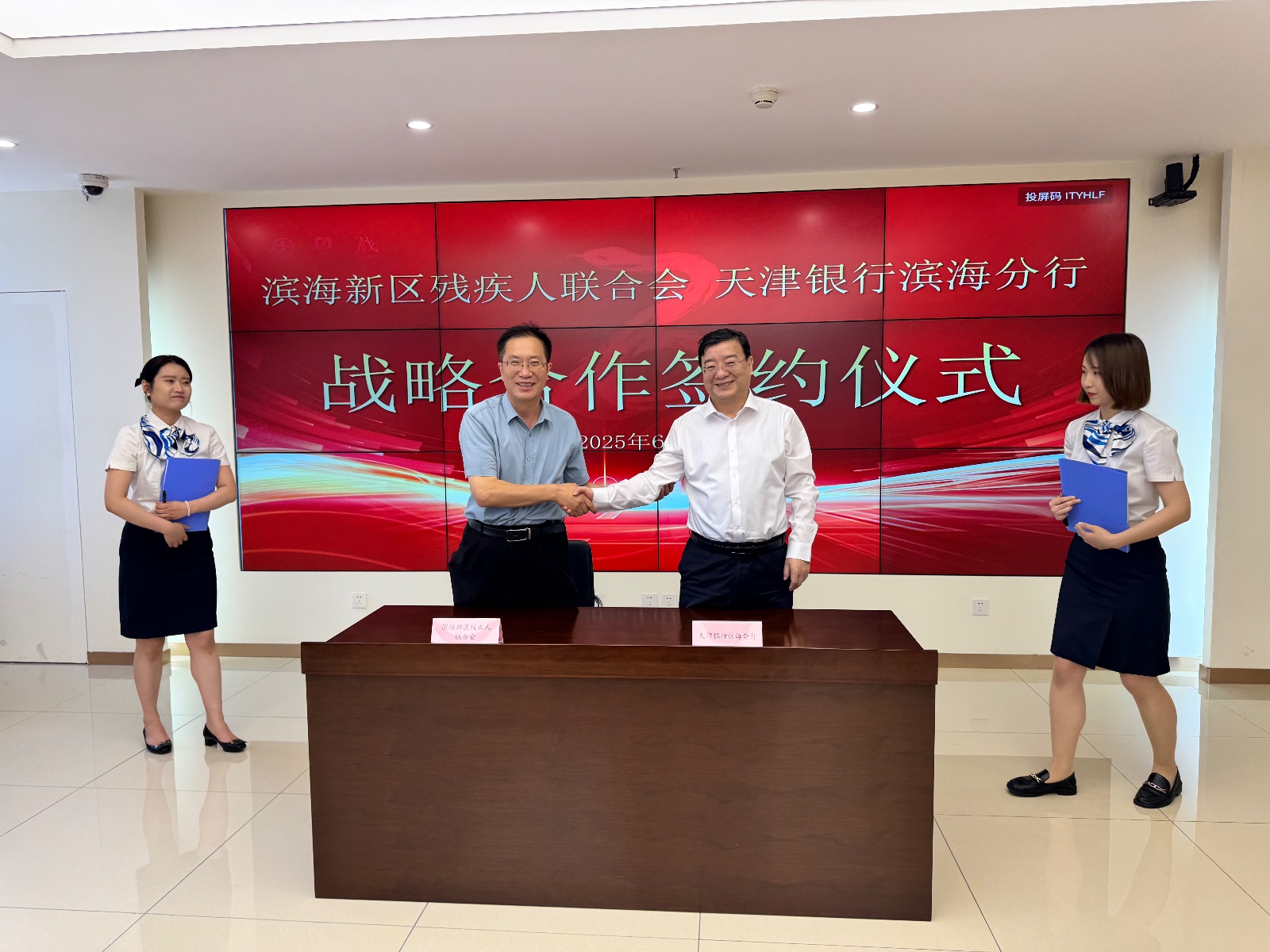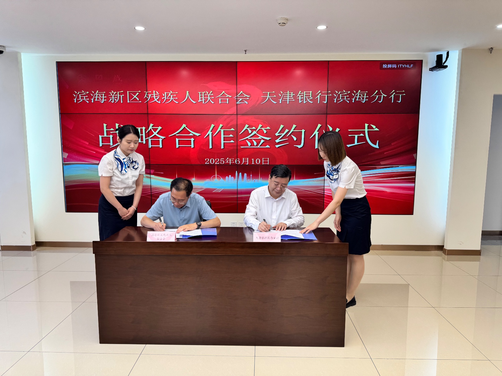 天津银行滨海分行和滨海新区残疾人联合会相关负责人参加此次签约仪式。战略合作协议正式签订,标志着滨海新区“金融+助残”模式迈出新步伐,双方将以签约为起点,持续探索更多惠残举措,为残疾人平等参与社会生活提供坚实保障。天津银行滨海分行积极向残疾人宣传推广金融产品,为他们提供个性化 、差异化的金融服务。并为其开通绿色通道,对行动不便的残疾人,进行上门服务。