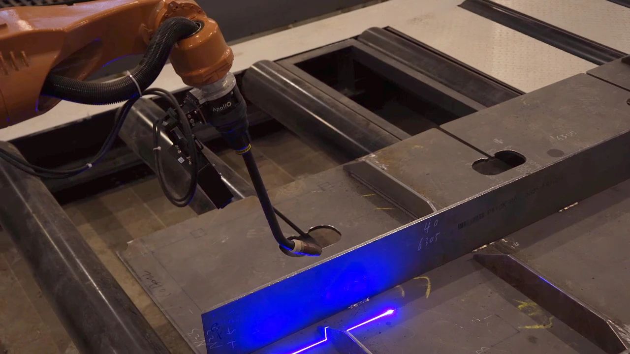 为实现零件的精准配送与管理,产线引入托盘化管理概念,利用信息化手段对船体结构零件进行全流程管控,满足了智能生产的严苛需求。同时,3台 RGV 输送小车和 KBK 吊装设备构建起高效的物料输送与装配体系,保障了生产环节的紧密衔接。该产线投入运营后,预计年产能可达54000吨,节约人力超50%,实现了配料、输送、装配、焊接的一体化智能生产。(中船天津供图)