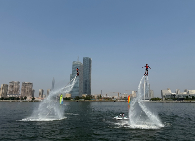 随着一声声悠长的鸣笛划破天际,天津游艇俱乐部正式启动。水面上腾空而起的“飞龙”表演交相辉映。专业表演者驾驭水上飞行器,时而直冲云霄,时而俯身击水,在空中划出绚丽弧线,引得现场观众阵阵惊叹。这场视觉盛宴不仅展现了现代水上运动的魅力,更寓意着天津游艇产业将如蛟龙入海,开启波澜壮阔的新征程。