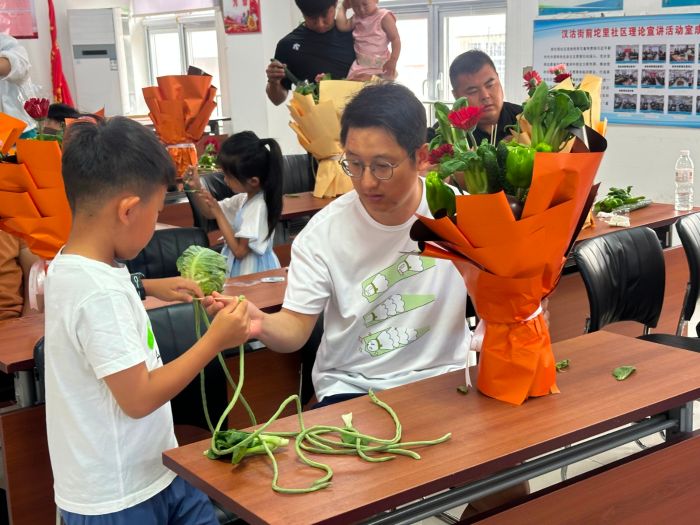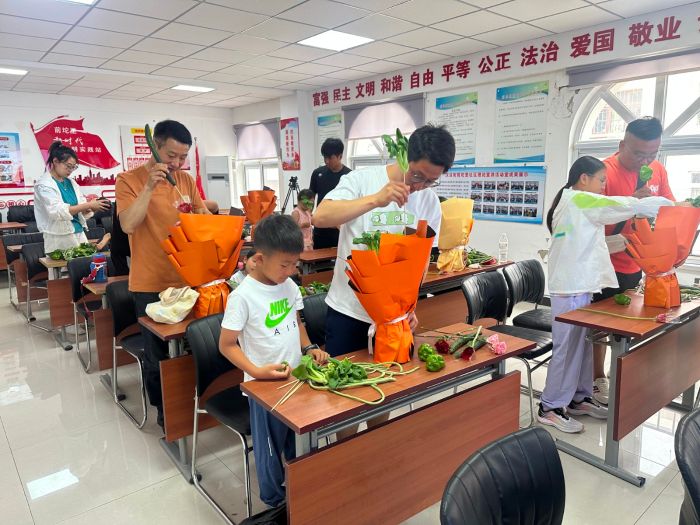 津滨网讯(记者 赵伟 通讯员 于魏 摄影报道)“爸爸,这朵‘茄子康乃馨’送给您!”“我的‘黄瓜鲜花’献给爸爸!”6月14日上午,汉沽街道前坨里社区活动室里菜香混着笑声,10多组户外劳动者家庭正用茄子、卷心菜等蔬菜制作创意花束。这场名为“父爱如‘蔬’”的活动,让平时忙于送快递、扫街道的爸爸们,和孩子一起玩出了新花样。