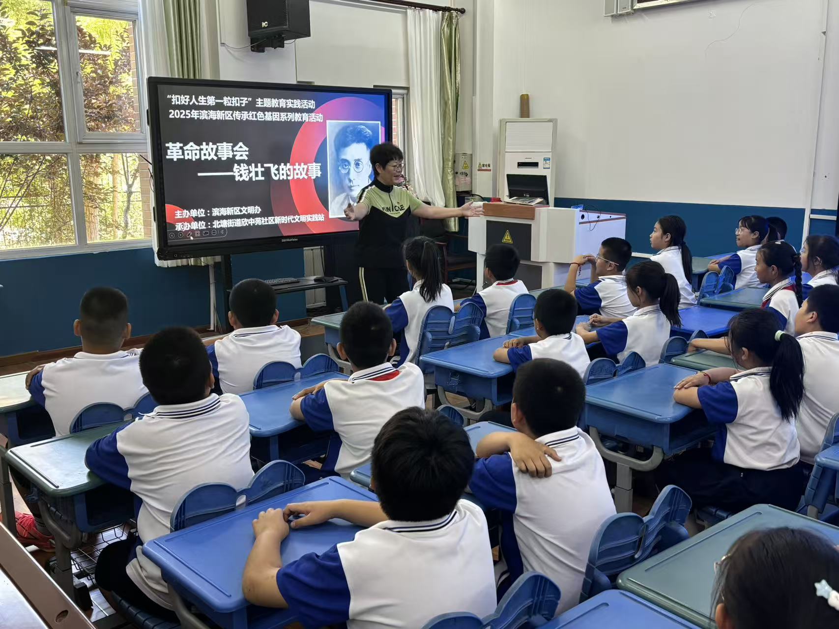 津滨网讯(记者 张玮 摄影报道)为引导辖区青少年继承发扬革命先辈的光荣传统,培育爱党爱国的坚定信念,近日,北塘街道欣中苑社区邀请滨海新区区委党校科研室党支部薛秋艳老师赴欣嘉园第一小学为学生讲授“钱壮飞革命英雄的故事”,通过革命烈士的英雄事迹,引导学生厚植爱党、爱国、爱社会的情感,让红色血脉代代相传。