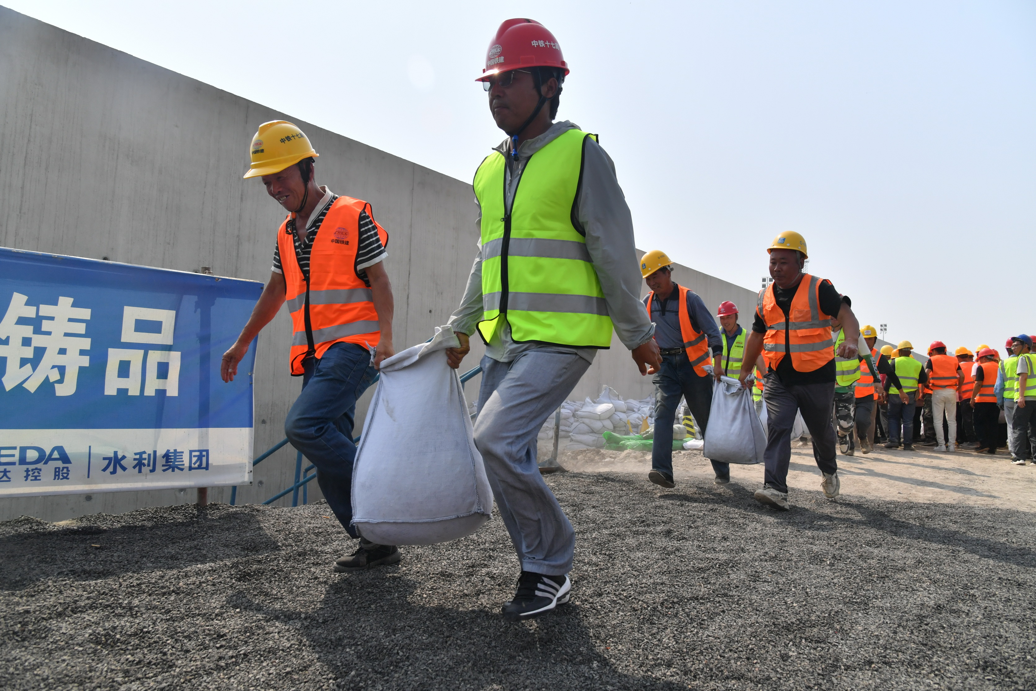 演练现场模拟施工围堰发生漫溢及现场基坑出现大量积水存在坍塌风险两种险情。针对险情,区水务局相关部门提前指导制定了详细的应急预案,并组织救援队伍进行现场处置。随着施工围堰漫溢“险情”的发生,现场指挥人员立即启动应急预案,组织人员紧急装填沙袋,迅速进行围堰加高加固,快速构筑起防线。