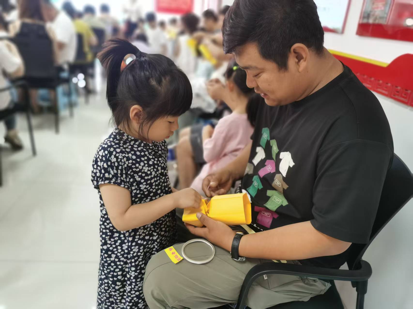 而活动现场最具仪式感的“巧手献爱·爱的加冕礼”环节,宛如一颗璀璨的明珠,照亮了整个活动现场。在手工老师的悉心指导下,孩子们用稚嫩的小手,将彩泥、卡纸等材料变成了一个个精美的“超级爸爸奖杯”。他们全神贯注,用心雕琢,每一个细节都倾注了对爸爸深深的爱。当孩子们小心翼翼地为爸爸佩戴上刻着专属昵称的荣誉勋章时,父子相视而笑,那温馨的画面被镜头定格,成了家庭相册中最珍贵的回忆。这场融合了创意手工与情感表达的仪式,让父爱不再抽象,而是通过孩子们亲手制作的奖杯具象化地展现出来。同时,也让“父亲角色”在双向互动中得到了重新诠释,爸爸们不再是那个严肃、忙碌的形象,而是成了孩子们心中最温暖的依靠和最崇拜的英雄。