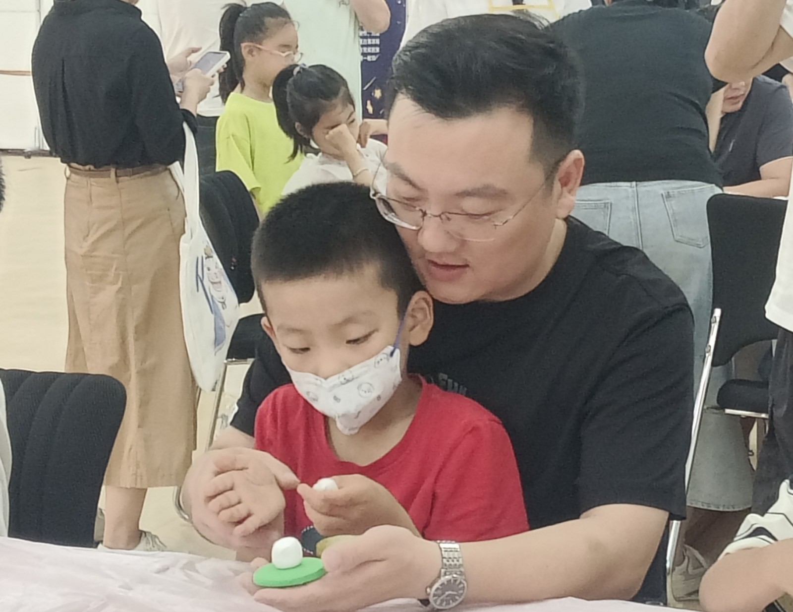 在非遗与艺术体验区,活动同样精彩。“捏一个你 捏一个我”非遗面人活动,职工与孩子围坐在一起,在非遗传承人的指导下,彩色面团变成栩栩如生的面人形象,这不仅是一次生动的非遗文化传承实践,更是珍贵的亲情纪念。“你眼中的爸爸”环节,孩子们用画笔绘出心中的超人父亲,有的是超级英雄,有的是陪伴成长的挚友,装裱后的画作郑重送出,让不少父亲热泪盈眶。“送爸爸夏日清凉”手工漆扇制作区,亲子共同调色,在空白漆扇上绘制精美的图案,一把把漆扇成为了父子间爱的见证,也为炎炎夏日增添了一份清凉与温馨。
