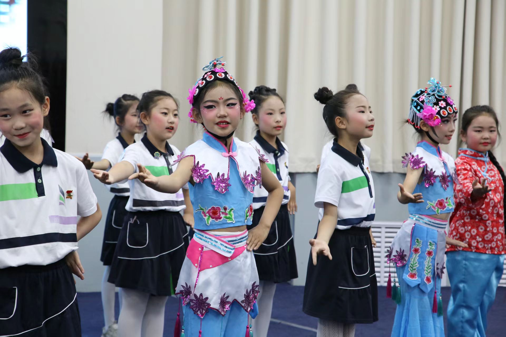 活动尾声,塘沽三中心小学的学生代表还带来戏曲舞蹈《梨园俏花旦》。孩子们用灵动的舞姿、俏皮的神态,将传统戏曲元素与现代舞蹈形式完美结合,活力四射,创意无限,充分展现了京剧艺术的别样风采。