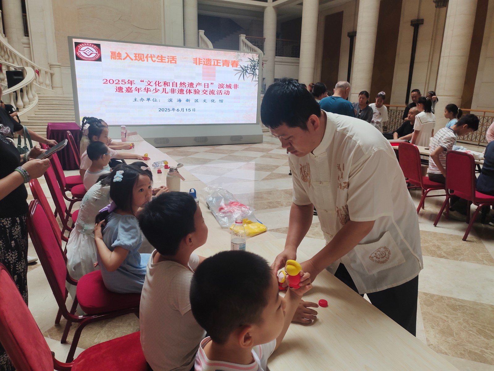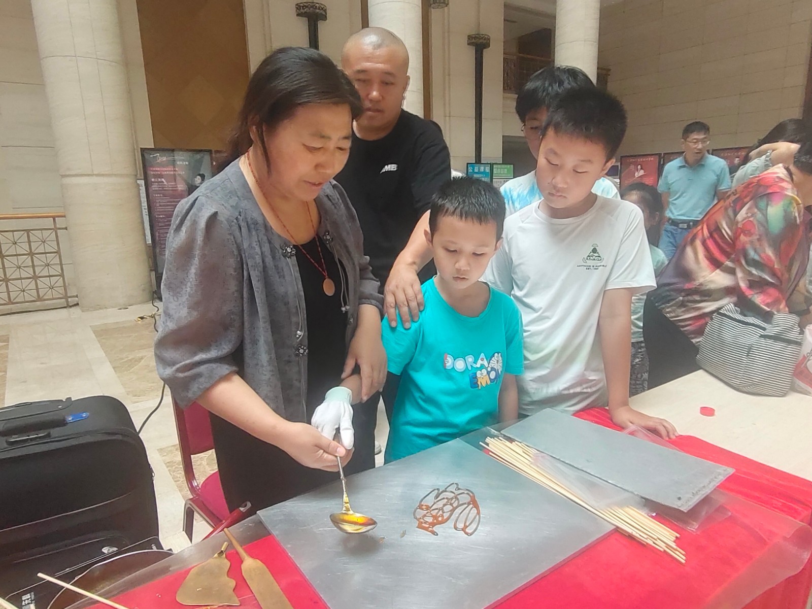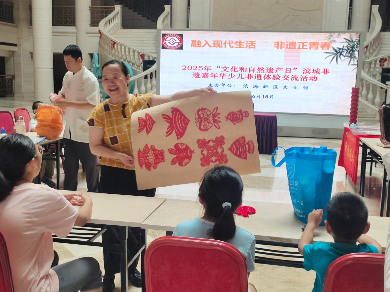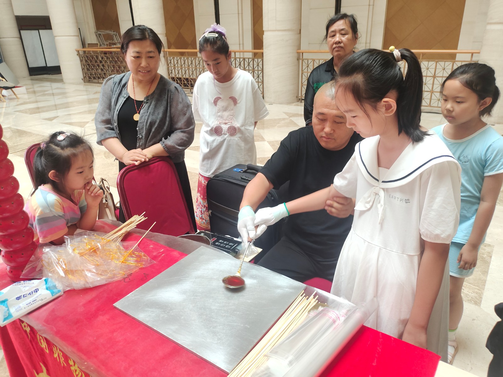 活动邀请市级非遗项目面人王工艺传承人王永艳、大港剪纸传承人单瑞金、区级非遗代表性项目大港女红民间艺术传承人曹俊姑、糖画王制作技艺传承人王拥军为青少年讲解非遗知识和项目特色,让孩子们体验简单的非遗项目制作。