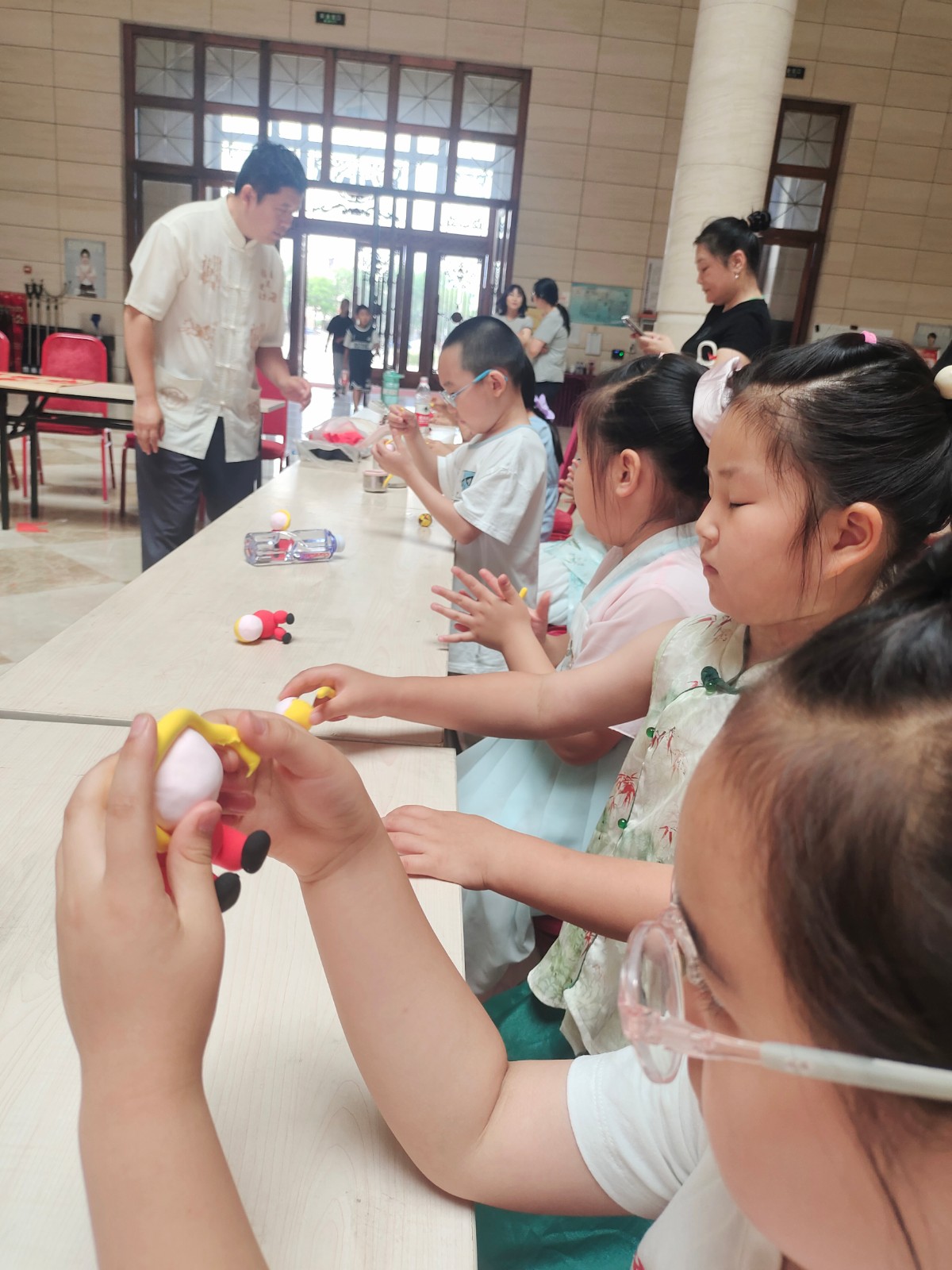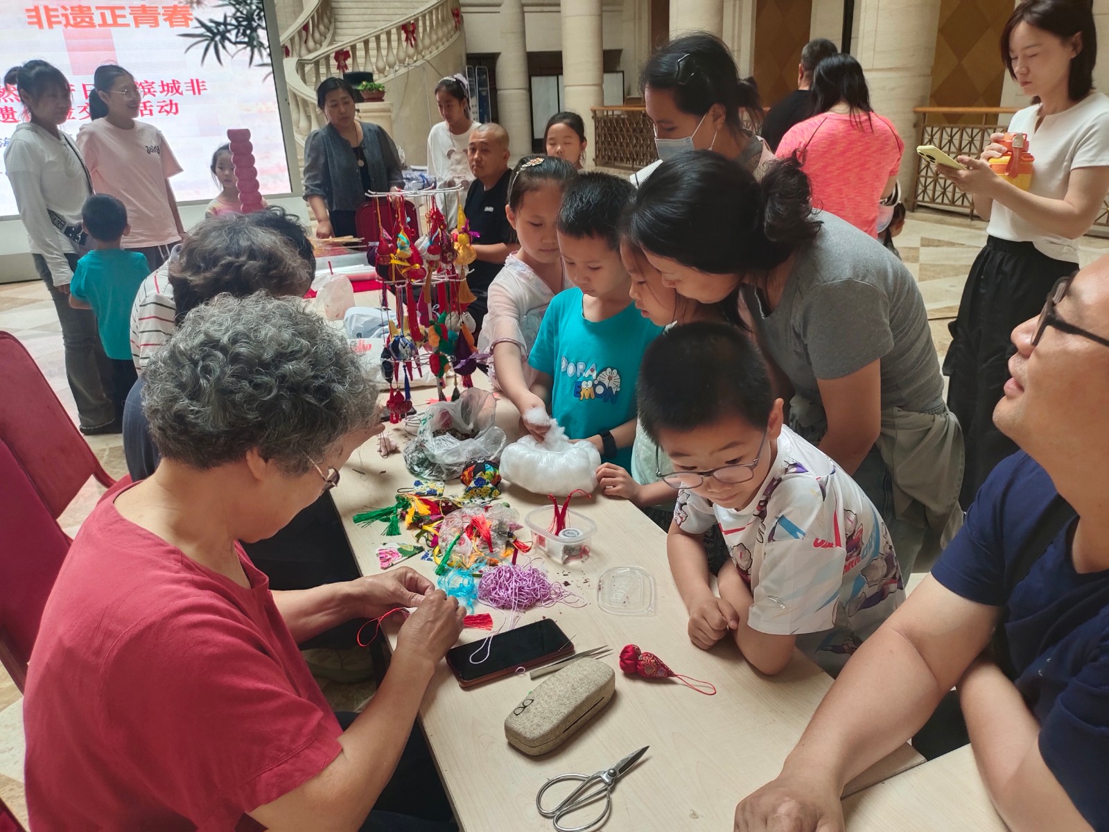 捏娃娃、做布粽子、剪燕鱼、做糖画兔子……共享大厅热闹非凡,孩子们兴奋不已。“贴面的泥一定要薄要平滑,这样贴出来的脸才好看,最后再贴上鼻子、眼睛和耳朵。”面人王王永艳给小朋友们讲解了贴面工艺,一个个漂亮的贴面娃娃陆续做好,孩子们拿着自己的作品,别提多高兴了;剪纸传承人单瑞金教孩子们如何折纸和如何剪线条,孩子们在传承人的指导下,一条条活灵活现的燕鱼很快就剪好了;女红非遗制作也受到孩子们的青睐,曹俊姑给孩子们准备了粽子和葫芦两种布艺香包,并带着孩子们缝制。先缝上挂绳,再缝型,然后塞棉花,最后封边缝上流苏穗,孩子们沉浸其中,一针一线专注地缝制,成品出来时,孩子们迫不及待地和自己的作品拍照留念;最受欢迎的当属糖画了,闻着糖的香味,孩子们围着糖画王王拥军问这问那。王拥军手把手地教孩子们从兔子耳朵画起,然后画身子尾巴,一气呵成一笔画出一个个小兔子。几个非遗项目简单制作体验后,孩子们深深地感受到了传统文化的博大精深。