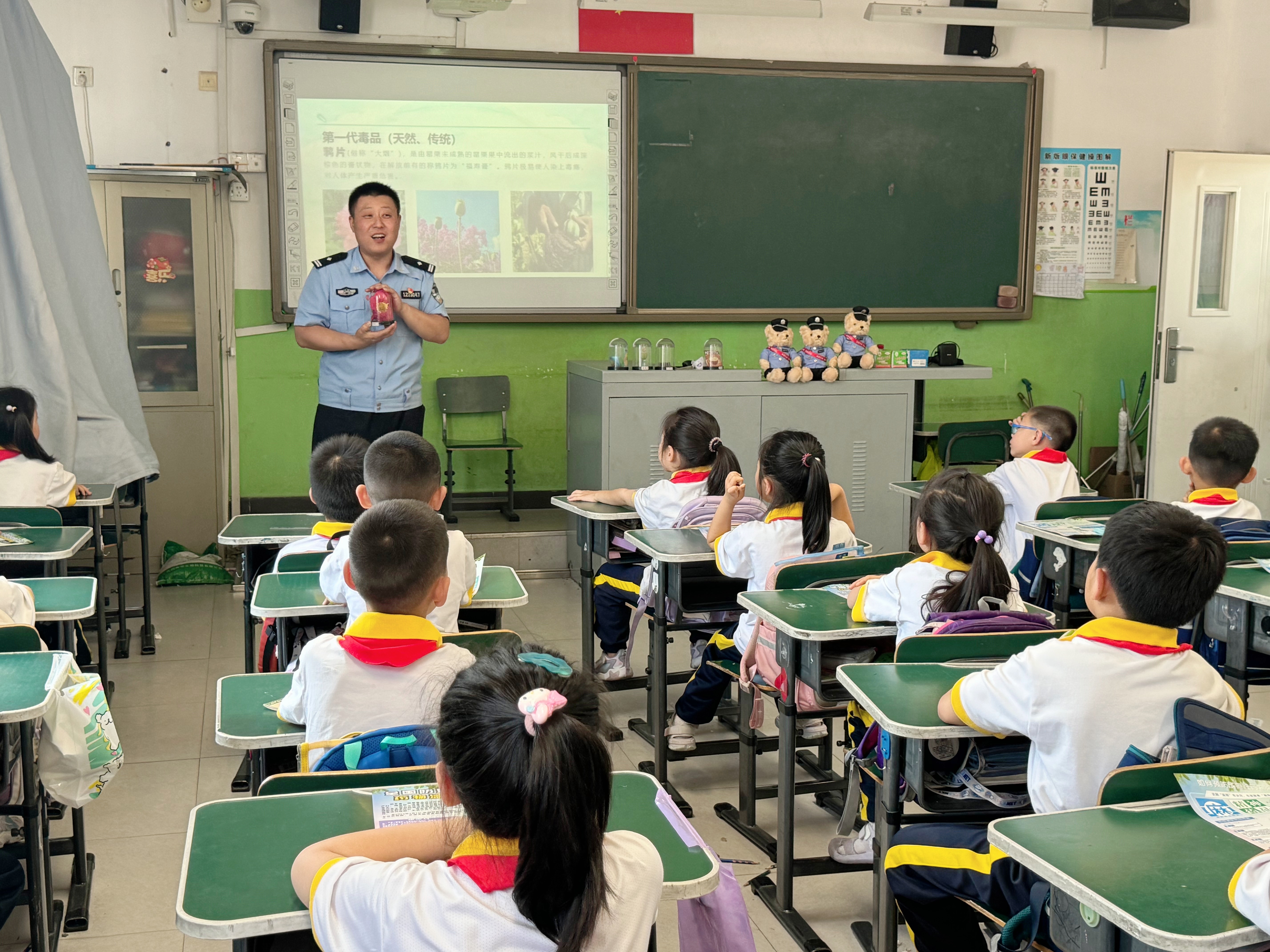 活动现场,来自强制隔离戒毒所的刘警官结合青少年身心特点,用通俗易懂的语言向师生们详细介绍了毒品的种类、特征及危害。从传统毒品鸦片、海洛因,到新型毒品“奶茶”“跳跳糖”,再到极具伪装性的第三代毒品,通过图片展示、播放动画短片的形式,揭露了毒品的隐蔽性和欺骗性,警示同学们警惕“娱乐放松”“提神助考”等涉毒陷阱。在“仿真毒品模型展示区”,同学们近距离观察毒品外观,直观认识到毒品的多样性。在趣味问答环节,主持人话音刚落,同学们的小手立刻高高举起。“不能吃!要告诉警察叔叔!”“要跑去找老师!”孩子们争先恐后地回答,答对的小朋友开心地领到了禁毒主题小礼物,脸上洋溢着自豪的笑容。“用孩子们喜欢的方式传递禁毒知识,效果特别好!”现场老师感慨道。