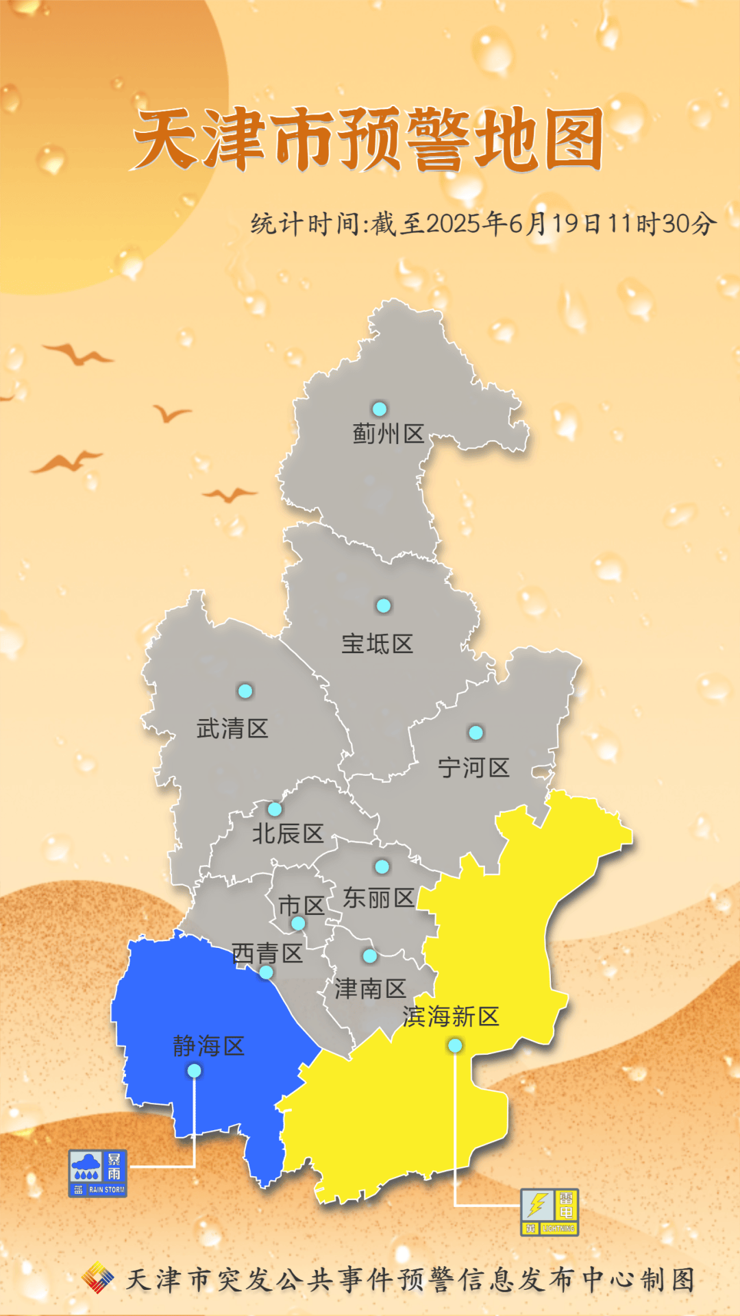 以及静海区暴雨蓝色预警、滨海新区雷电黄色预警