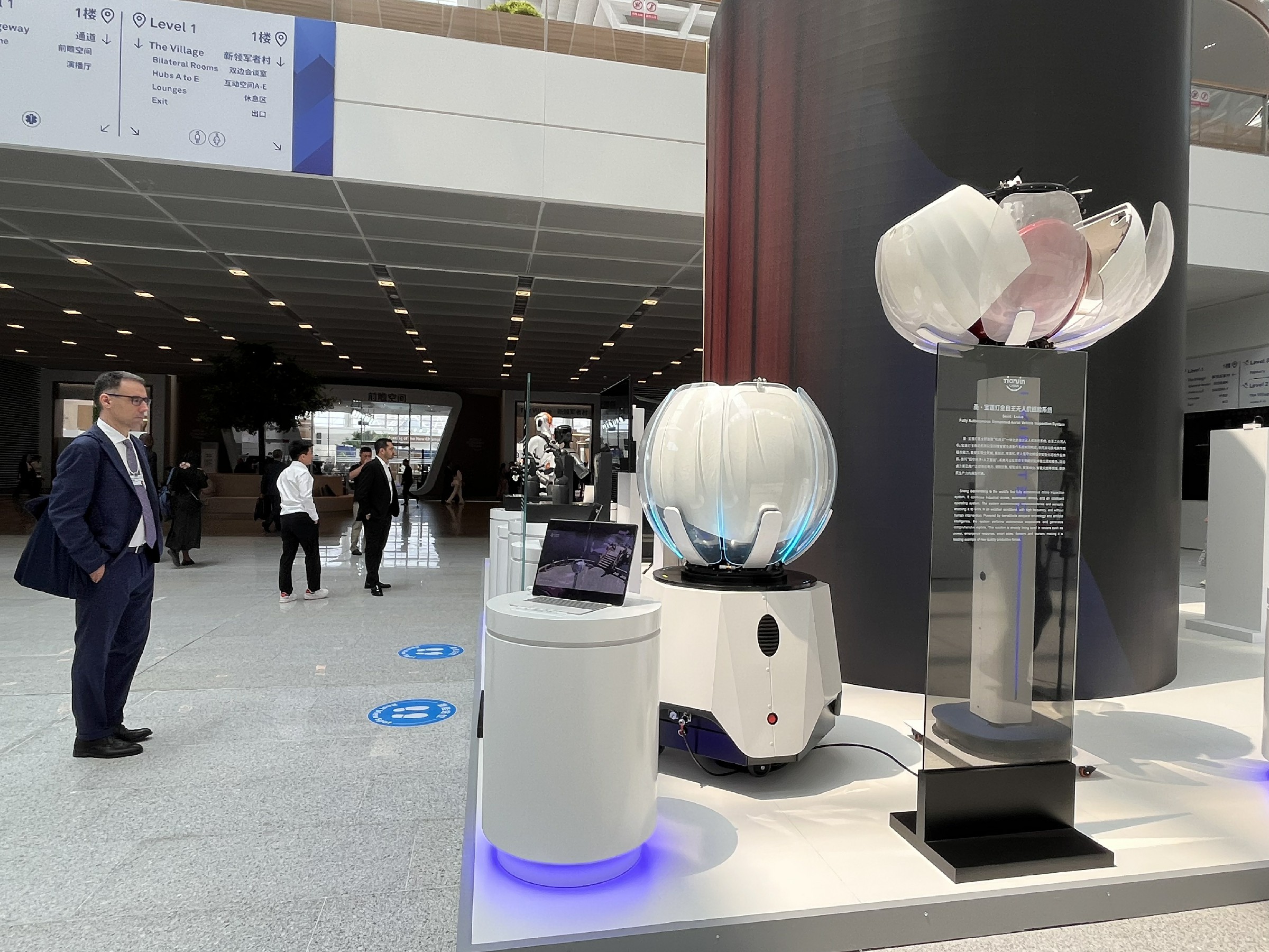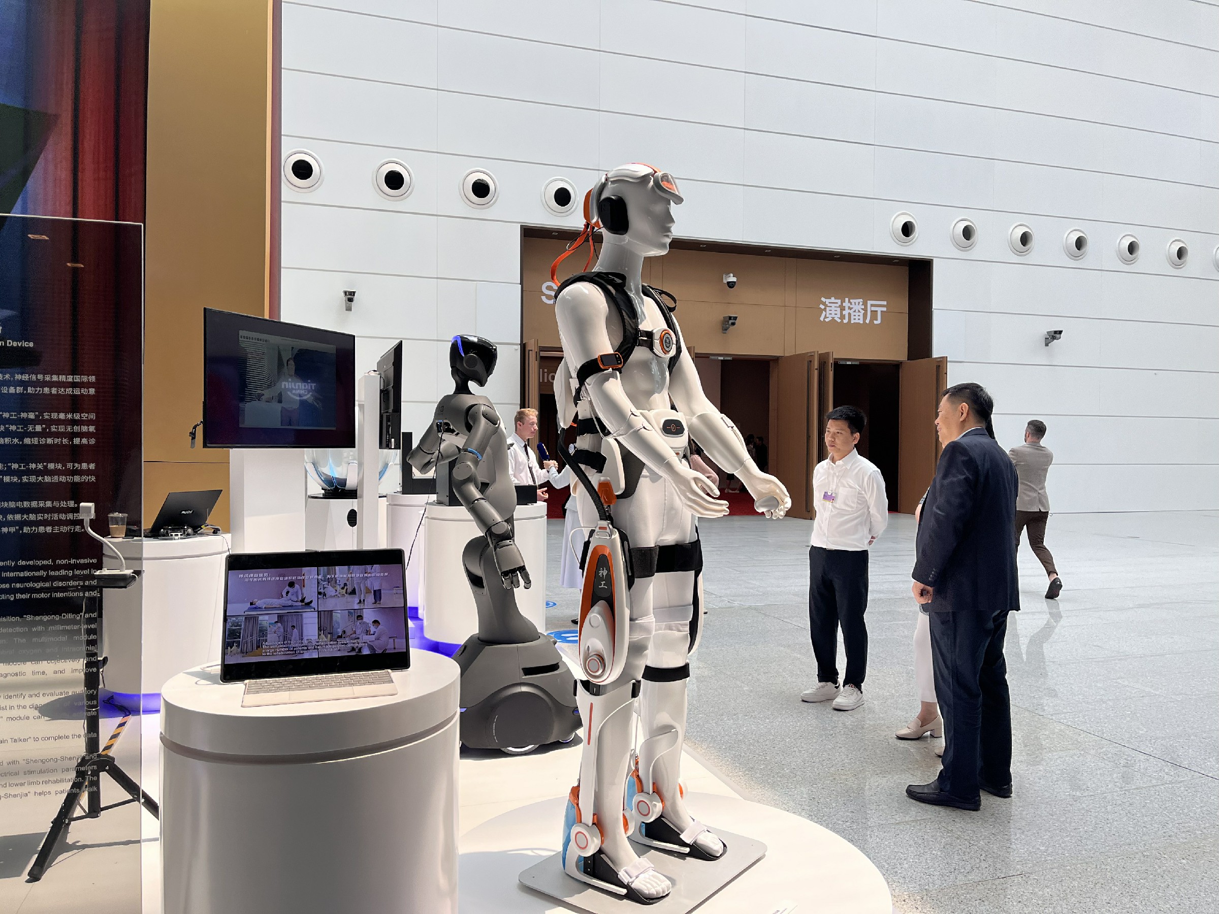 在该展区,模型身上从头“武装”到脚的非侵入式脑机交互设备也成为一大“吸睛”元素。这套设备系统集成了全国产自主知识产权的无创脑机交互技术,脑电识别精度、控制指令数量和信息传输率3项核心指标均达到国际领先水平。这套技术不仅能实现神经功能障碍疾病的诊断,也可以控制外部设备群,助力患者达成运动意图,实现肢体康复。