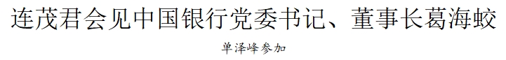 津滨网讯(记者 徐晶晶)6月24日,市委常委、滨海新区区委书记连茂君会见中国银行党委书记、董事长葛海蛟一行。区委副书记、区长单泽峰参加。