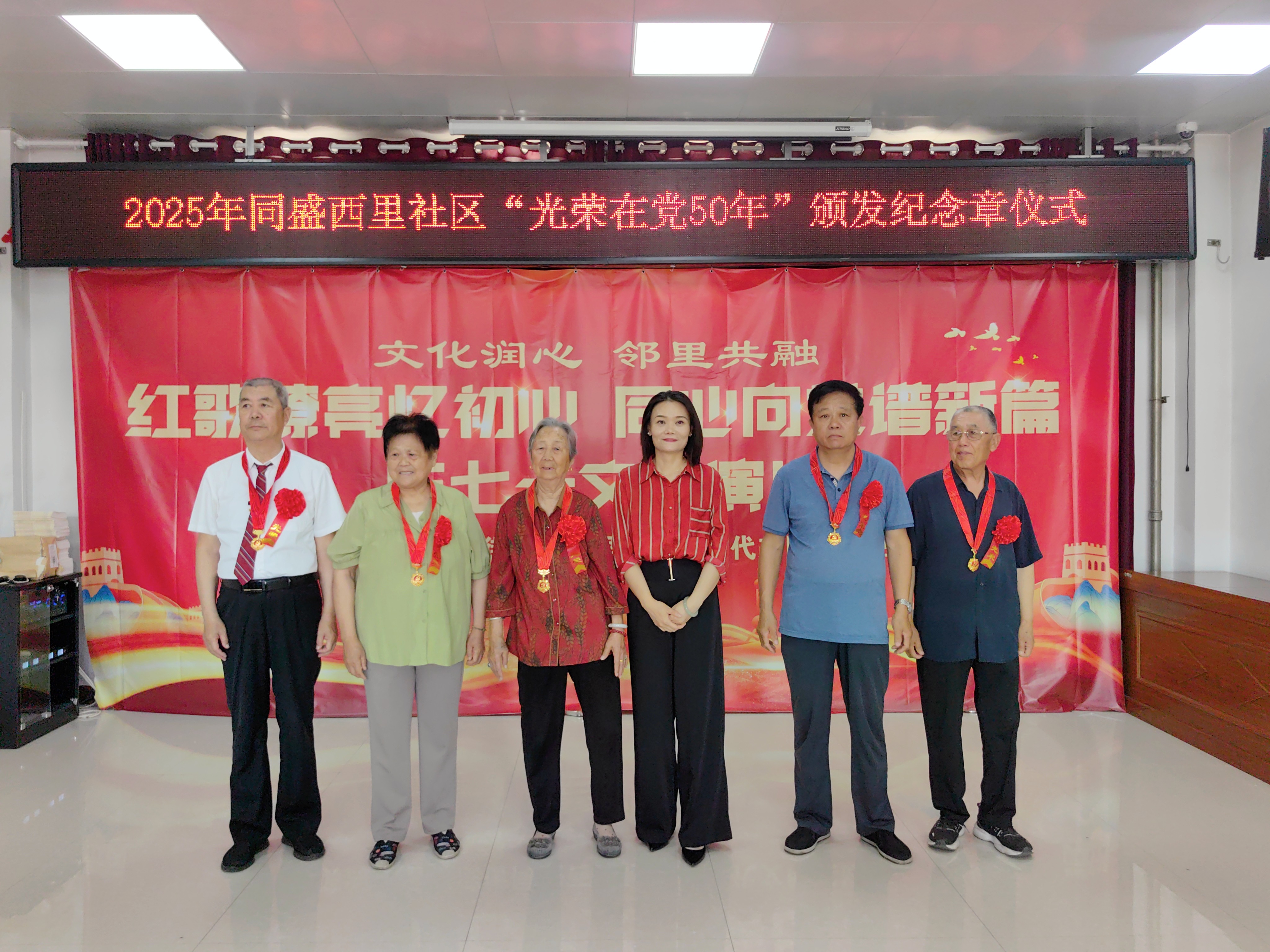 演出中,“光荣在党五十年纪念章颁发” 环节尤为庄重。社区为党龄满五十年的老党员颁发纪念章,老党员们胸前闪耀的奖章,是对党忠诚与奉献的见证,他们的故事激励着年轻一代传承红色精神,接续奋斗。