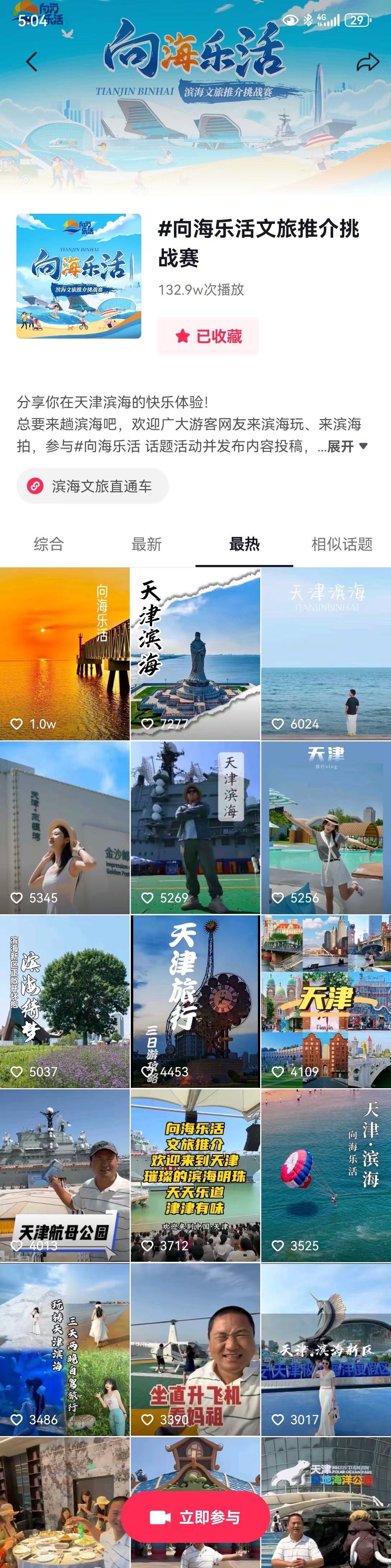 津滨网讯(记者 果琳)暑期在即,“#向海乐活文旅宣传推介赛”抖音话题,您刷到了吗?