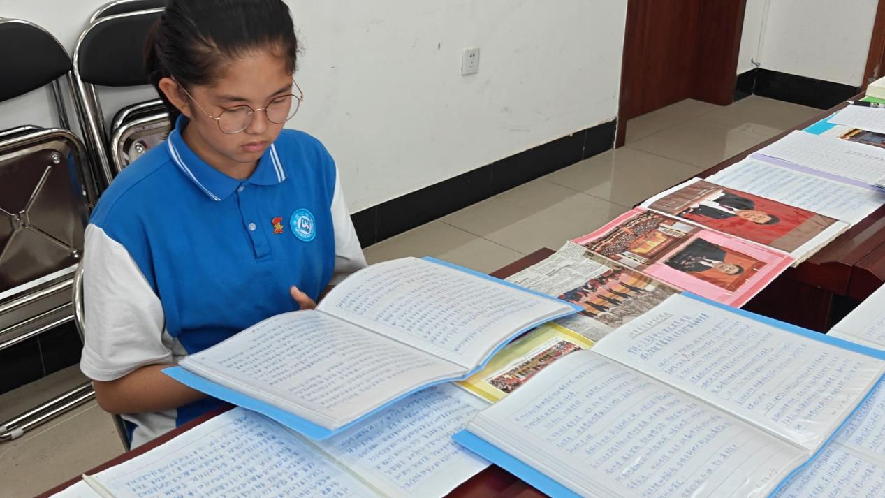 活动现场,展台上整齐摆放着许焕声的党史学习笔记,泛黄的纸页上,工整的字迹力透纸背,20余万字的内容涵盖了从党的一大到二十大的光辉历程,既有对重大历史事件的深刻解读,也有结合自身经历的感悟与思考。每一页笔记都凝聚着老党员对党的忠诚与热爱,吸引了众多党员、群众、团员、青少年驻足翻阅。