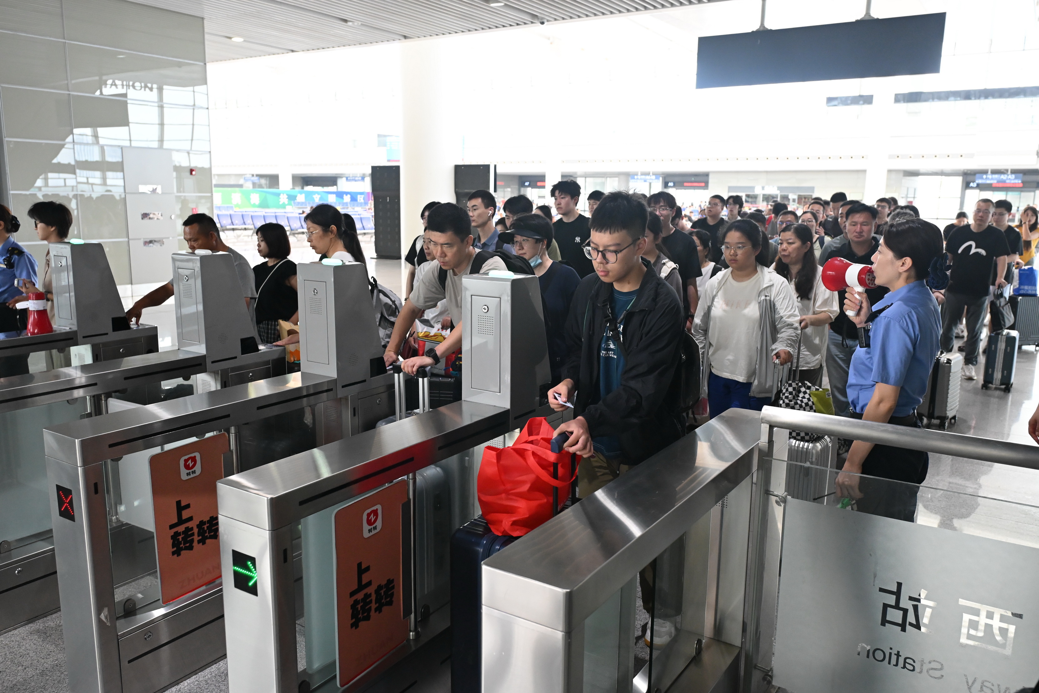 “滨海站暑运期间的日发送量大概是8000人。”滨海站客运值班员王蕊介绍说,“我们提前对自动售票机、检票闸机、电扶梯这些设备进行全面的检查,保证运行正常。在大客流时,我们会及时开启东侧的进站通道,保证旅客出行顺畅、安全。同时,我们对服务人员开展了培训,要求他们做好方位指引和重点帮扶工作,进一步提升旅客进站乘车的体验感。”