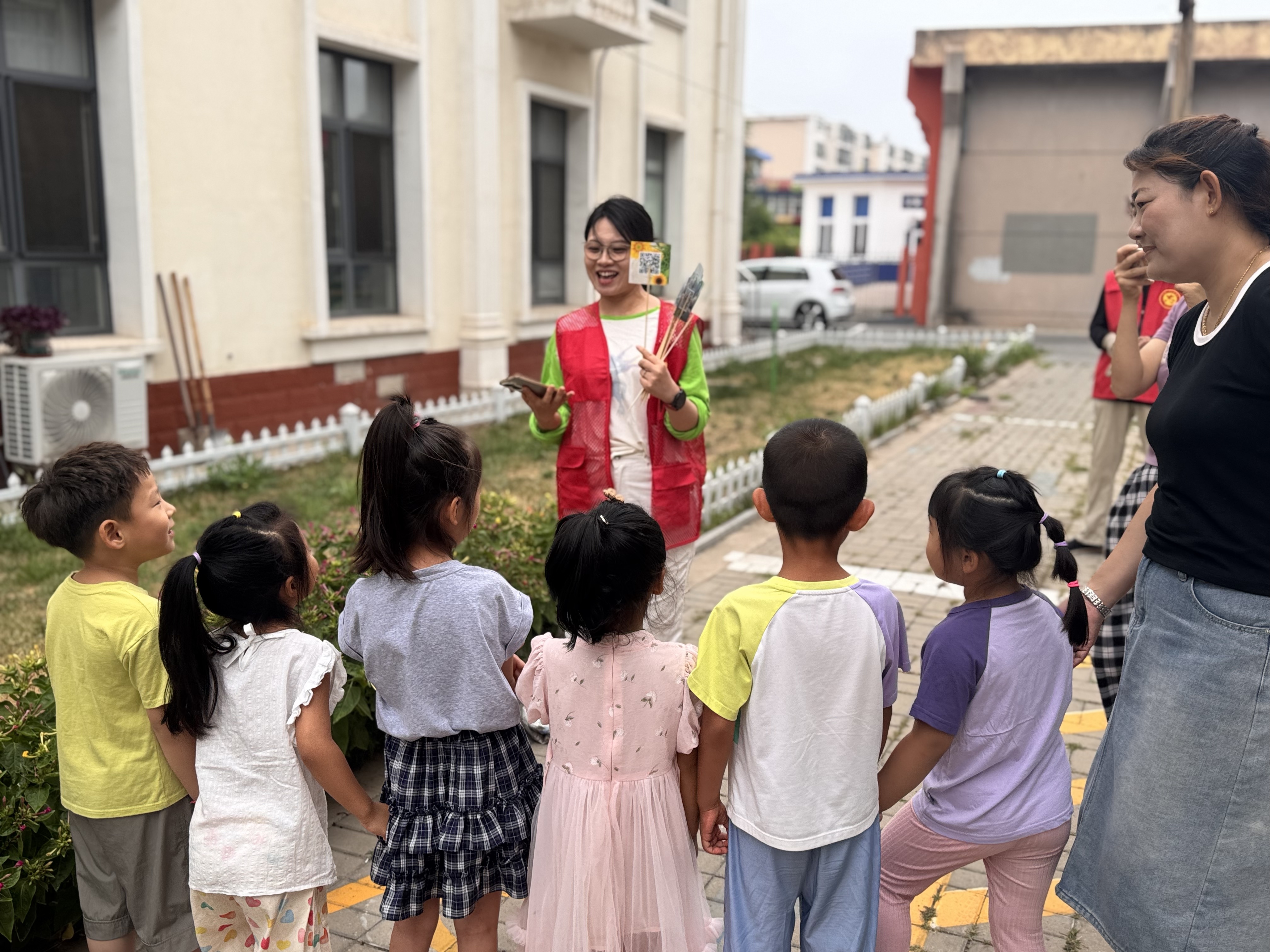 活动特别设置了红色记忆传承环节。孩子们录制的抗战小故事和双语国花通过技术手段转化为语音二维码,制作成别致的“记忆花牌”插在“上合绿”花圃中。扫描花牌上的二维码,就能听到孩子们用稚嫩声音讲述的《鸡毛信》《小兵张嘎》等经典故事,实现“花开有声、历史有痕”的沉浸式教育效果。