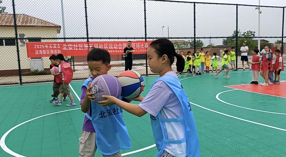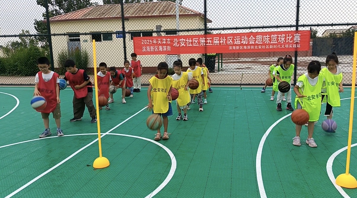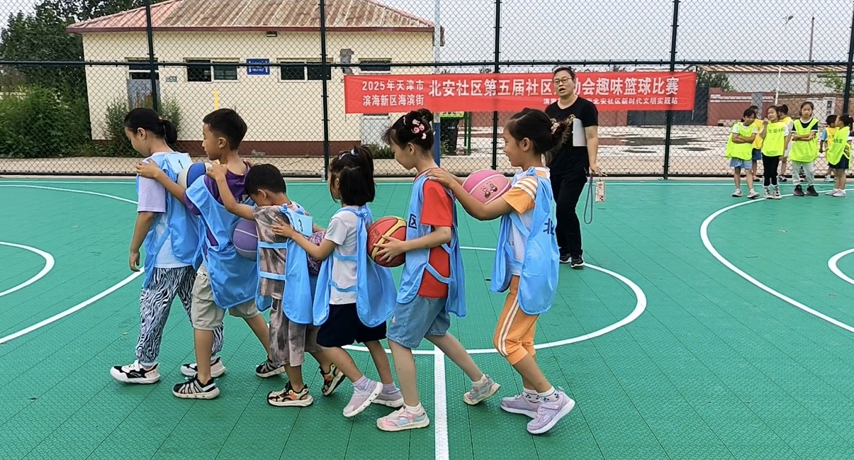 在北安社区的运动场上,一场别开生面的趣味篮球比赛拉开帷幕。孩子们身着色彩鲜艳的篮球背心,分为不同小组,蓄势待发。场地四周,家长们纷纷驻足围观,为孩子们加油助威,现场气氛热烈而欢快。