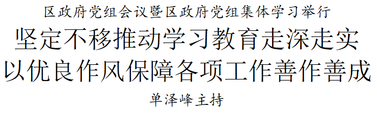 会议指出,中央八项规定是长期有效的铁规矩、硬杠杠,作风建设绝非一朝一夕之功,必须常抓不懈、久久为功。区政府系统各级党组织要深入学习贯彻习近平总书记关于加强党的作风建设的重要论述,严格对照中央八项规定及其实施细则精神,把自己摆进去、把职责摆进去、把工作摆进去,全面检视在作风建设方面存在的短板弱项和风险隐患,切实加强政府系统党的作风建设,推动学习教育走深走实。