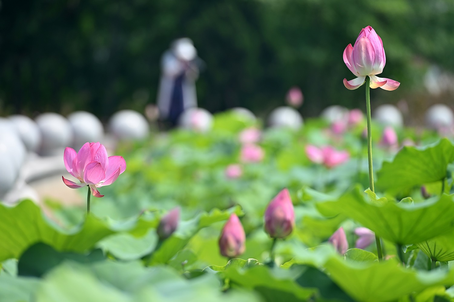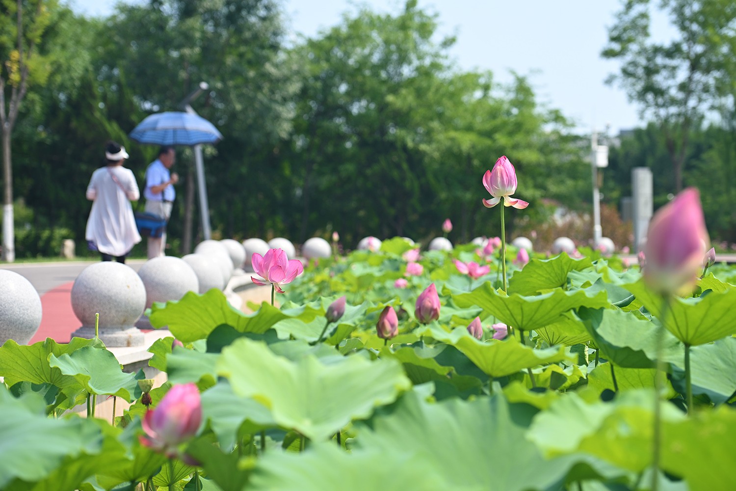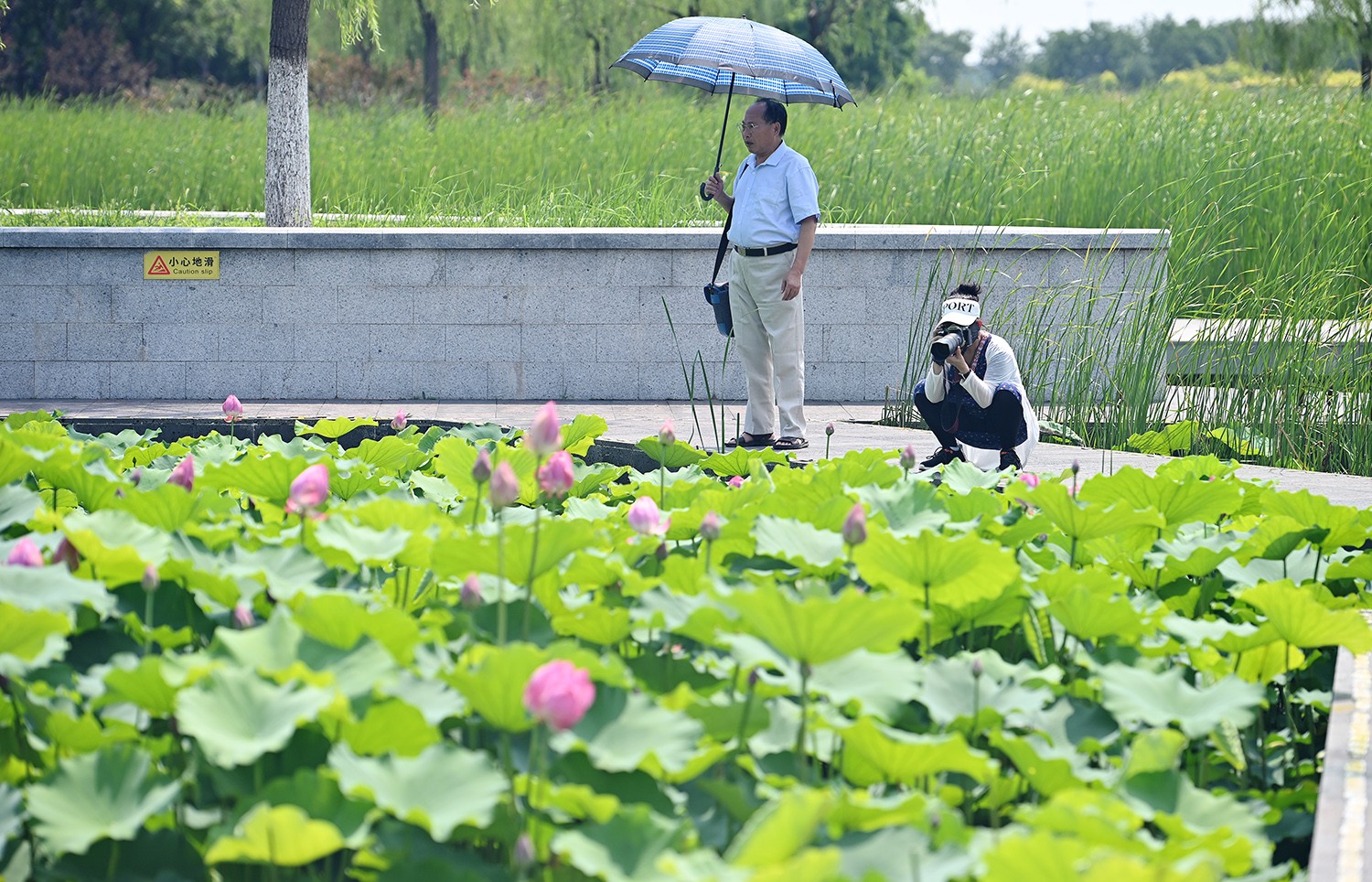 津滨网讯(记者 贾磊 摄影报道)7月9日,正值小暑节气,滨城骄阳似火,天津港保税区临港生态湿地公园却别有一番生机盎然的景致。园内草木郁郁葱葱,湖面碧波荡漾,水芝园池塘中,粉白相间的荷花正肆意绽放,层层叠叠莲叶间,莲花亭亭玉立,引得游人纷纷驻足观赏、拍照留念。