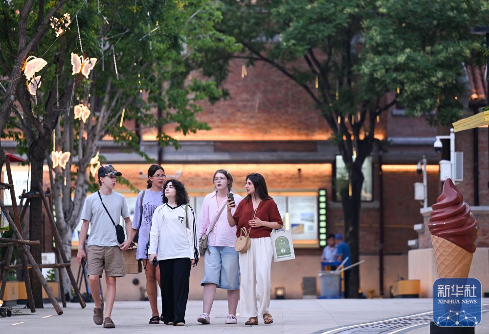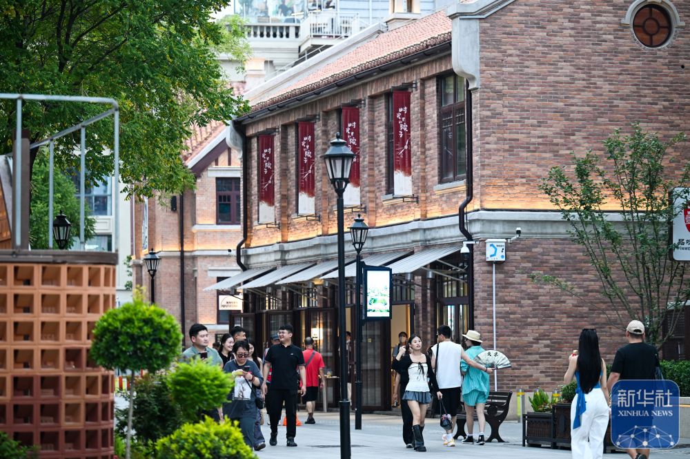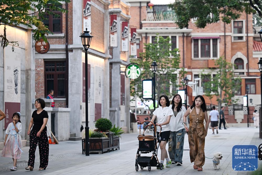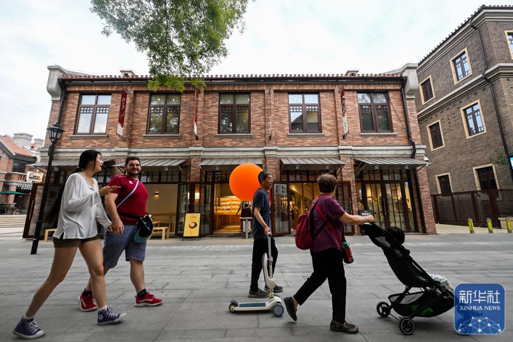 ↑ 游客在天津五大道步行街散步休闲(7月9日摄)。