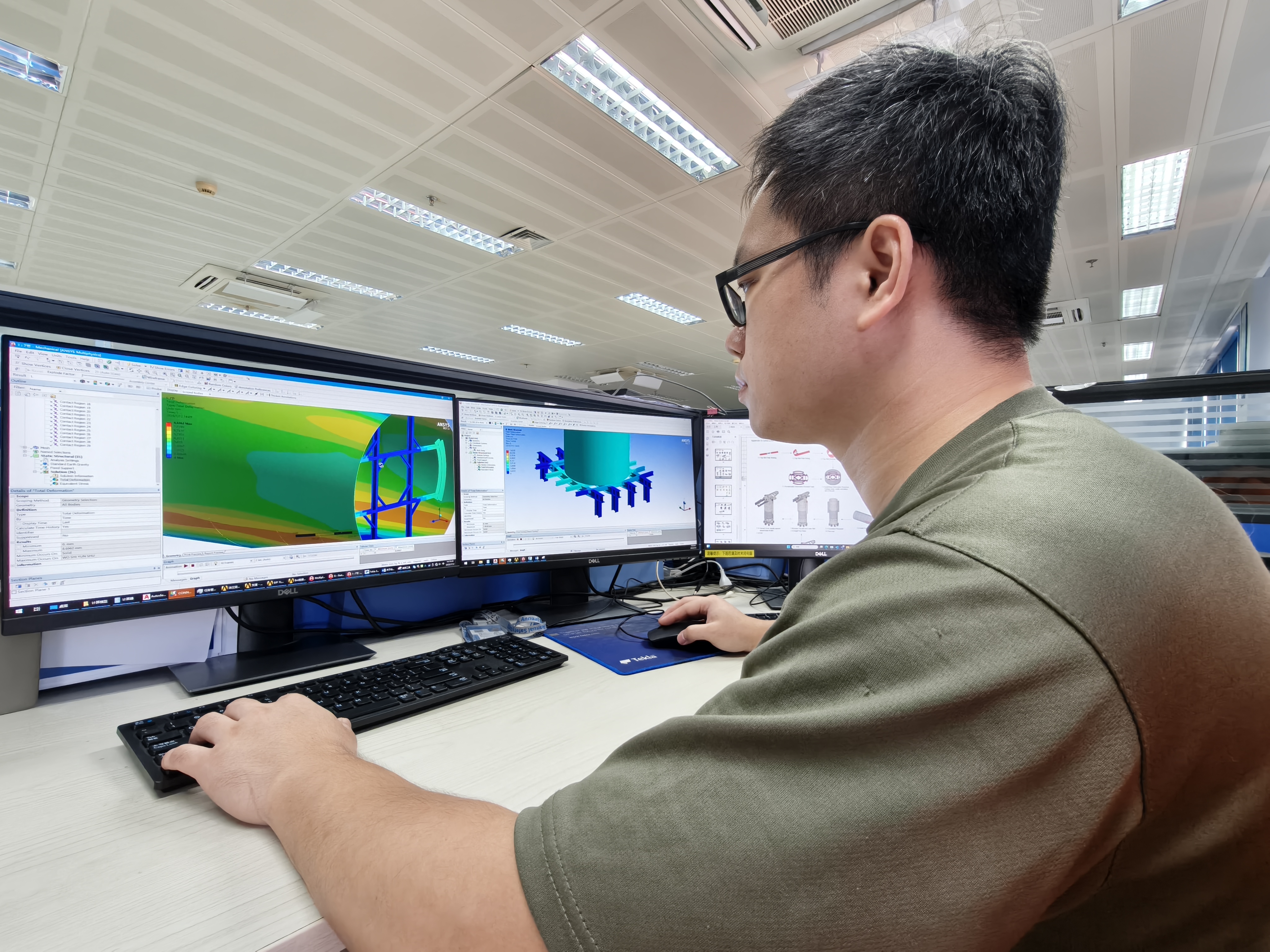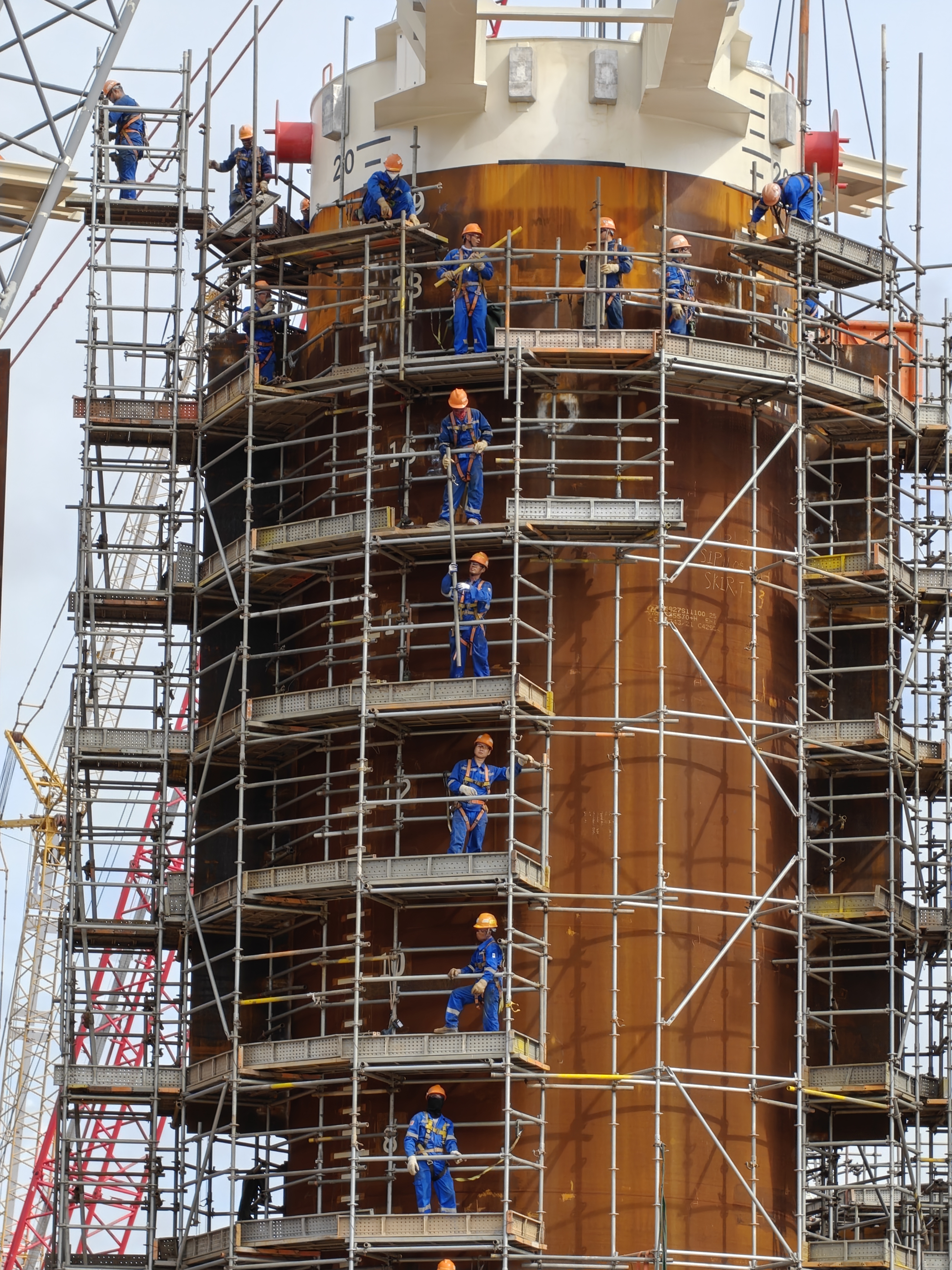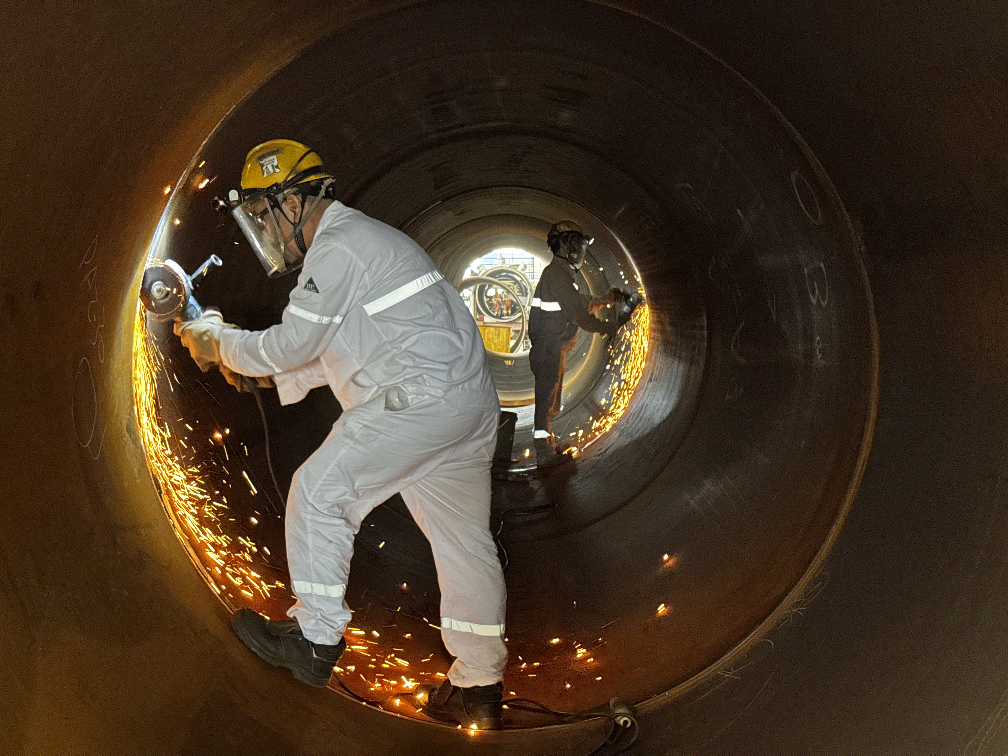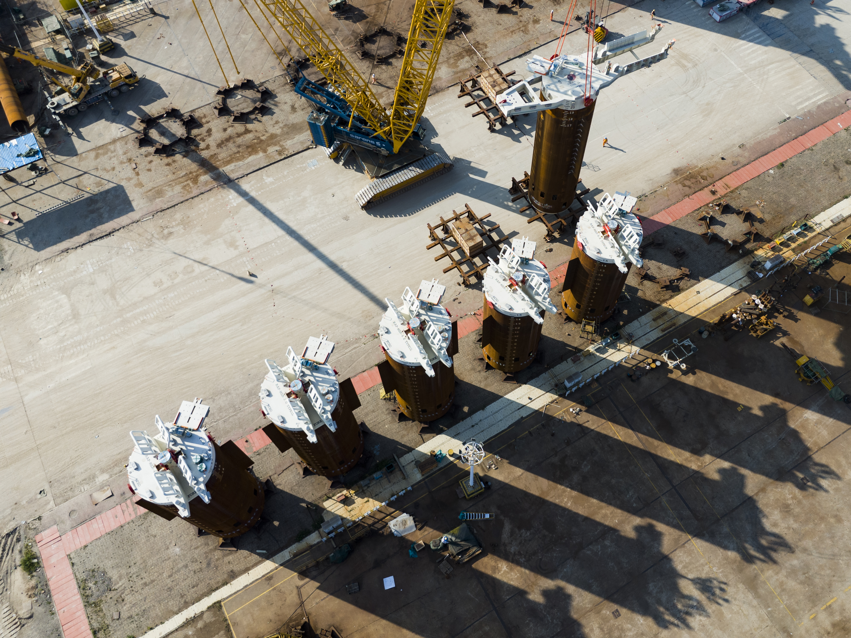 Mero二期吸力锚最大建造单体高达21米,直径达8米,而壁厚仅为25毫米,是典型的薄壁大直径筒体结构,对项目建造提出很大挑战。项目团队通过技术攻关,在国内首创超深水吸力锚卧式接长、立式总装调试建造工艺,创新采用“旋转筒体再吊装”等总装方案,大规模应用三维扫描测量、有限元模拟测试等先进技术,自主研发“米字支撑工装”等施工装备,解决了超大直径尺寸精度控制、超薄壁厚变形控制等诸多技术难题,实现质量合格率超过99.9%,精度偏差每米不超过1毫米,整体达到行业先进水平。