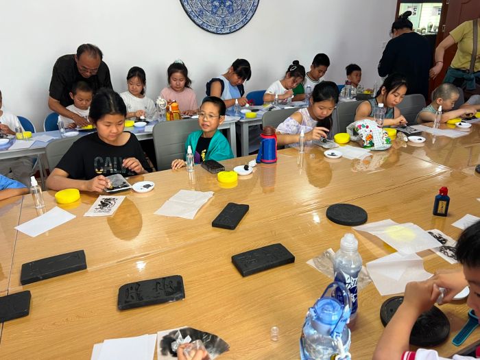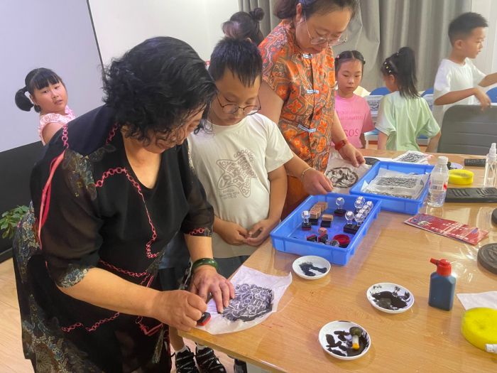 讲解结束后,孩子们在工作人员的指导下,用宣纸和墨块,亲手拓印出瓷器上的经典图案。缠枝莲纹在拓片台上苏醒,墨香混着童声:“老师!我的宣纸上开出了元朝的花!”