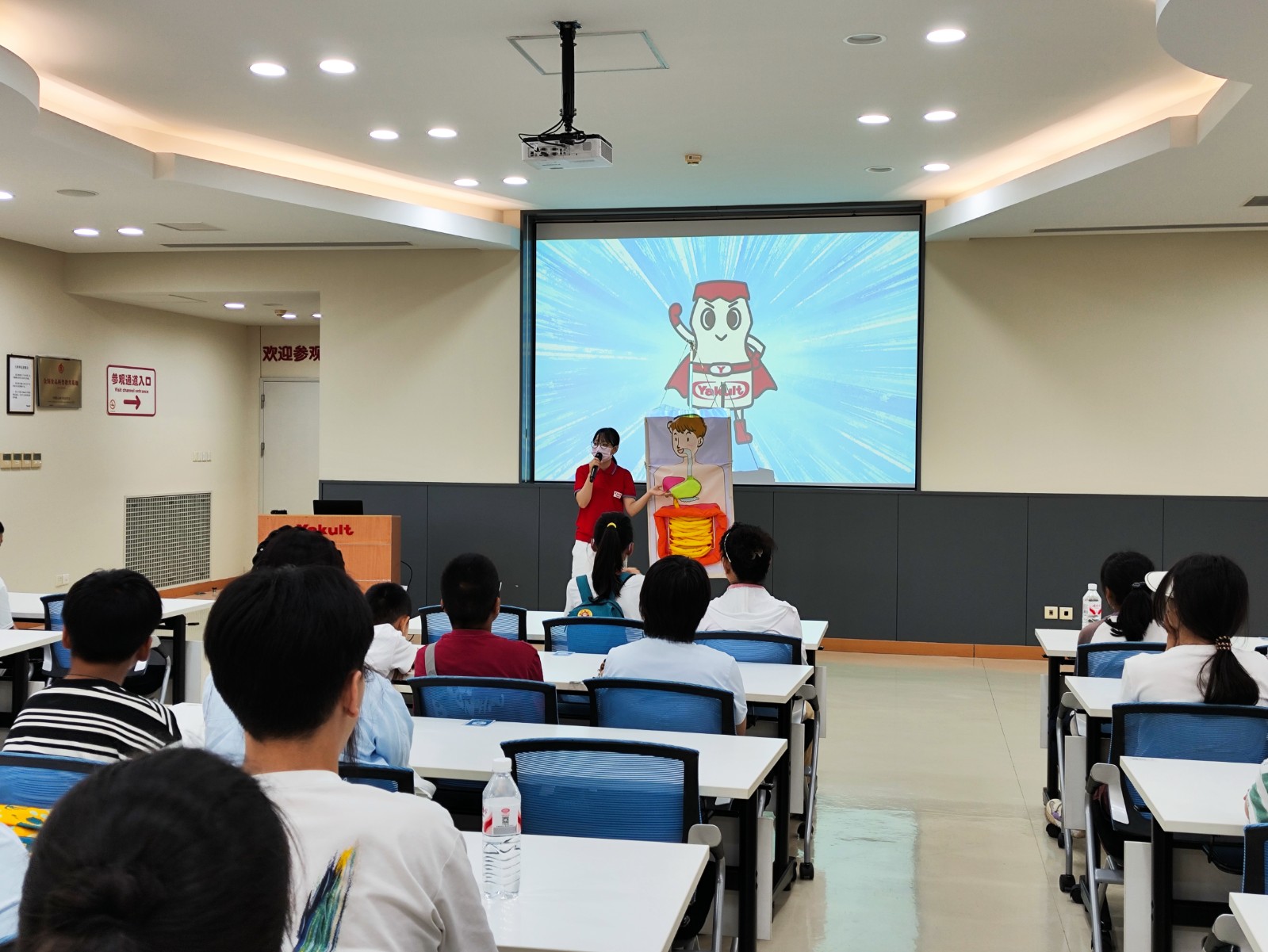 到达养乐多工厂后,工作人员首先介绍了品牌的起源与历史。随后,大家通过观看养乐多健康短片,了解了消化道构造、活性乳酸菌对人体的益处以及益生菌等知识,通过生动有趣的互动活动,以深入浅出的方式展现了肠道微生物与健康的关系,让孩子们了解到挑食会引发的不良问题。