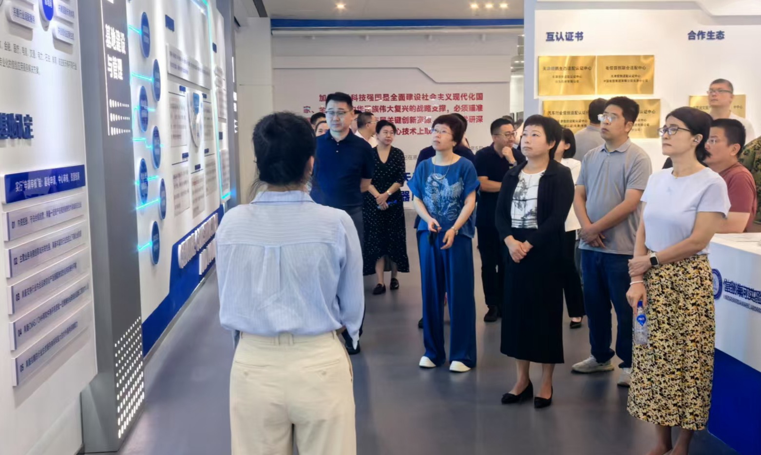 在天津信息技术创新展示中心,调研团一行认真聆听了信创产业前沿技术、创新成果及应用场景的详细介绍。从芯片研发、操作系统创新到网络安全防护体系的构建,深入了解了信创产业全链条的发展现状与趋势,在互动交流环节,大家围绕技术突破难点、市场应用前景等问题,与展示中心技术人员深入探讨。