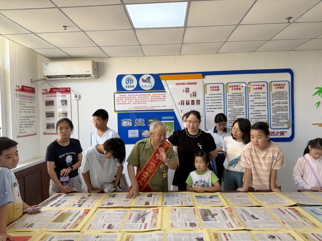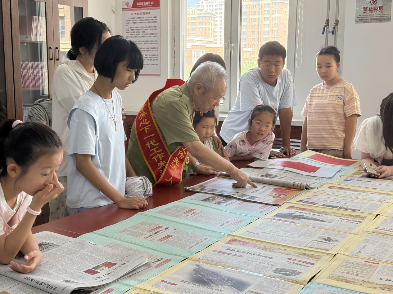 活动特别邀请了滨海新区关工委五老宣讲团宣讲员、全国关心下一代先进工作者孙玉斌到场。活动中,孙玉斌带来8册珍贵的集报剪报藏品,包括纪念建军90周年特刊、建军92周年剪报收藏、纪念建军98周年军地周刊专刊等,涵盖数万字文献与图片,展开后长达百米,为孩子们呈现出建军强军的辉煌历程。他结合藏品,讲述了人民军队在抗日战争、解放战争中浴血奋战的历史,以及新时代强军事业的发展,引导孩子们铭记历史,传承军魂。