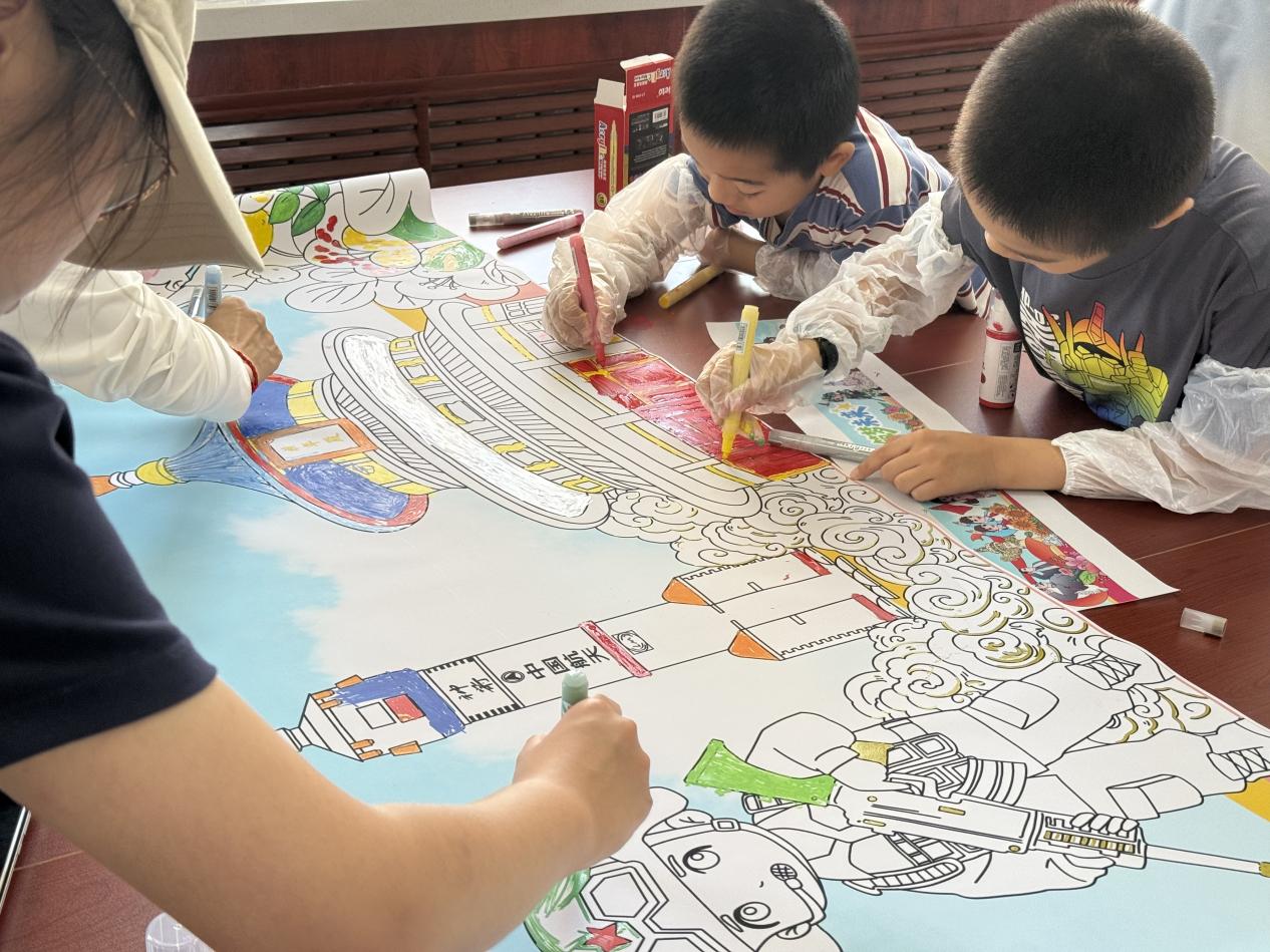 剪报展览之后,社区还特别设置了互动环节——组织孩子们在几米长的画卷上共同涂色。沉浸式体验让严肃的历史知识变得鲜活可感,也让孩子们在协作中体会到团结奋进的力量,与剪报展览形成“看”与“做”的良性互动,深化了教育效果。