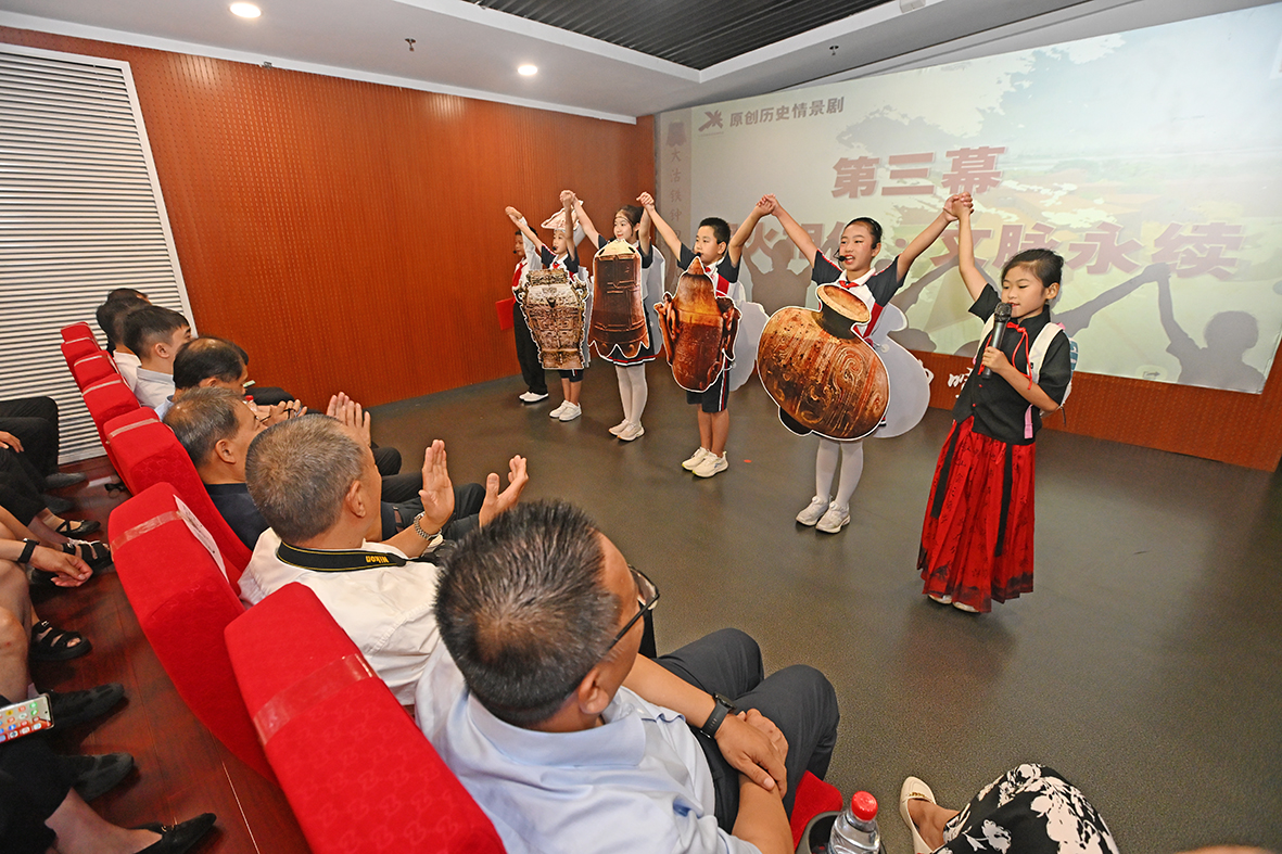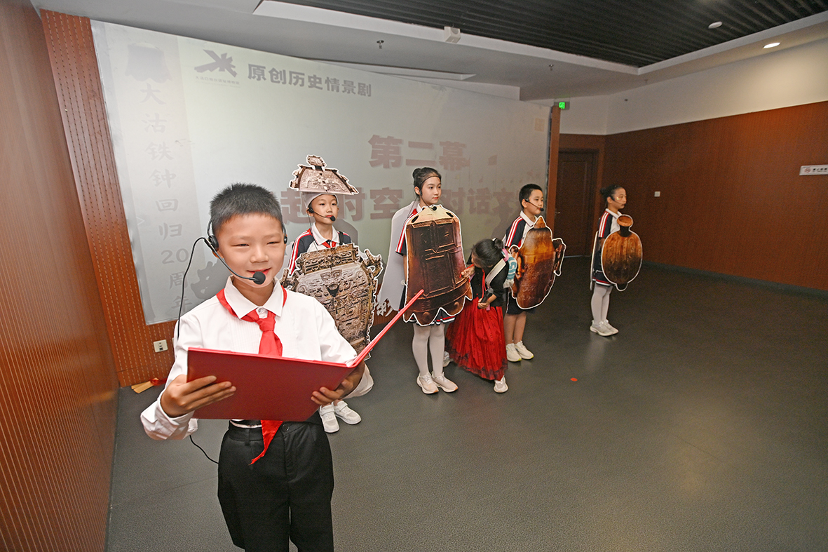 活动现场,传统艺术与现代表达交织,奏响文化传承的动人乐章。津门快板《铁钟铸魂传薪火》以铿锵韵律诉说铁钟承载的民族精神;青少年志愿者深情讲述《大沽钟的百年回家路》,大沽口炮台遗址博物馆创作,塘沽湾学校学生编排的情景剧《国宝回家》更以生动演绎,重现铁钟漂泊百年终归故里的温情故事,令在场观众无不动容。此外,活动特别设置云端共话环节,通过视频连线原塘沽区区委副书记荣新海、英国艺术家马可·刘易斯等亲历者,讲述铁钟回归背后的动人细节,跨越山海的文物情缘引发热烈共鸣。