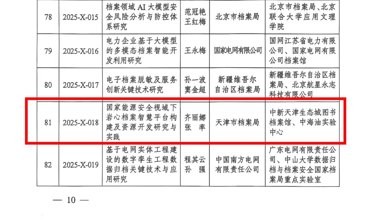 津滨网讯(记者 简讯)近日,国家档案局公布2025年度科技项目立项名单,由中新天津生态城图书档案馆与中海油实验中心联合申报的《国家能源安全视域下岩心档案智慧平台构建及资源开发研究与实践》成功入选。这是该馆近年来斩获的第5个国家级科技项目,再次彰显其在档案科研创新领域的强劲实力。