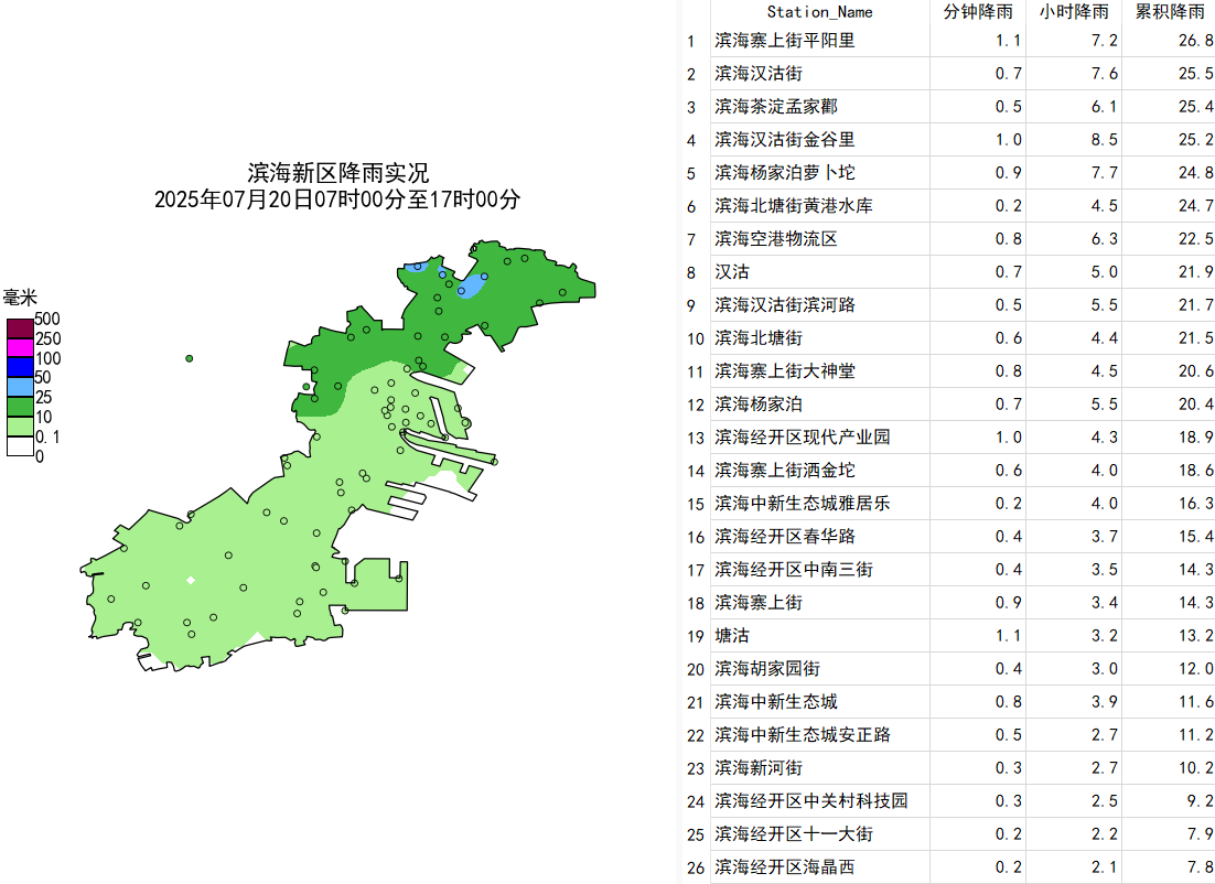 自2025年7月20日7时至17时,滨海新区降雨区平均降雨量9.0毫米,最大降雨量26.8毫米,出现在滨海寨上街平阳里,最大小时降雨量8.5毫米,出现在滨海汉沽街金谷里(9时54分),最大分钟降雨量2.7毫米,出现在滨海南港西港池(13时53分)。