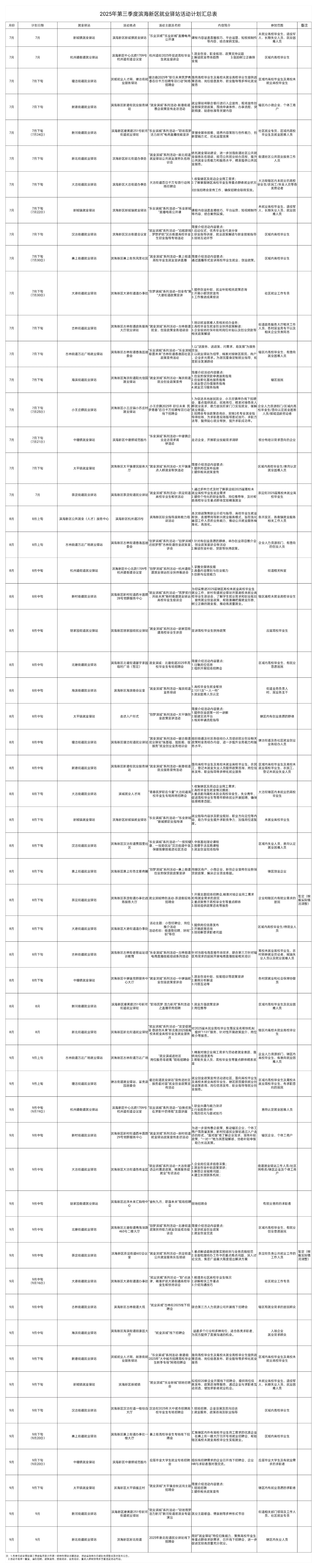 八月的活动覆盖重点人群帮扶、政策宣传、技能培训、业务培训和线上线下招聘会等多种类型。八月上旬,开展职业指导服务能力培训活动,聚焦职业介绍与指导、高校毕业生就业帮扶等新兴就业服务模式,提升基层工作人员业务能力。古林街万达广场就业驿站举办创业政策宣讲会,为有创业意愿的群体解读扶持政策。八月中旬,各街道就业驿站活动丰富,包括高校毕业生座谈会、招聘会、业务培训以及创业政策宣讲等。新村街就业驿站调研学生就业需求,宣传就业创业政策;北塘街计划举办高校毕业生专场招聘会,归集岗位信息,为求职者和企业搭建沟通桥梁。八月下旬,大沽街拟开展高校毕业生专场网络招聘会,新城镇开设职业指导课,汉沽街道进行中医保健按摩技能进社区活动,为不同需求的人群提供多样化服务。