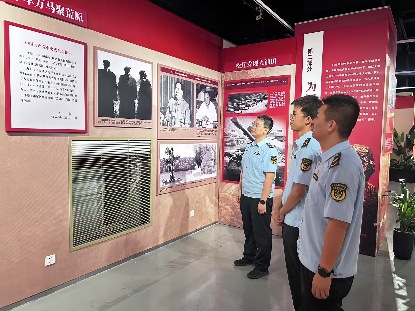 在“永远的铁人”展览区,一张张泛黄的老照片、一件件斑驳的旧工具,生动再现了王进喜“宁肯少活二十年,拼命也要拿下大油田”的豪迈誓言。党员们驻足凝视,有的轻声念出展板上的事迹,有的掏出手机记录“铁人”名言。“当年没有先进设备,靠人拉肩扛把钻机运进油田,这才是真担当!”一名年轻党员感慨道。