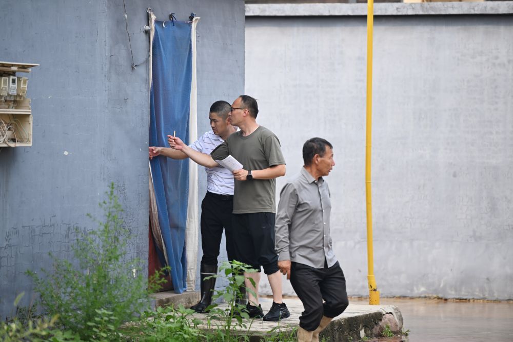 7月28日,张学超(左一)和同事们一道在下营村逐户进行转移动员工作。新华社记者李然 摄