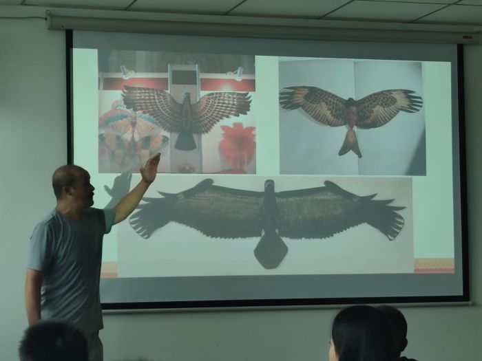 随着讲解深入,主讲人借助图片与实物展示,让大家领略刘氏风筝的多样风貌。传统题材风筝蕴含深厚文化内涵,如以瑞兽为造型的风筝,寓意吉祥如意;而融入现代元素的创新之作,则展现出刘氏风筝与时俱进的活力。其制作工艺精细复杂,从精选竹材、削制骨架,到绘制图案、糊裱风筝,每一步都凝聚着匠人的心血。现场展示的风筝,竹骨轻盈坚韧,图案精美绝伦,色彩搭配和谐,令观众赞叹不已。
