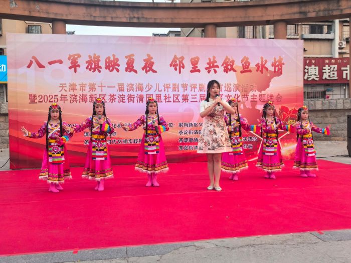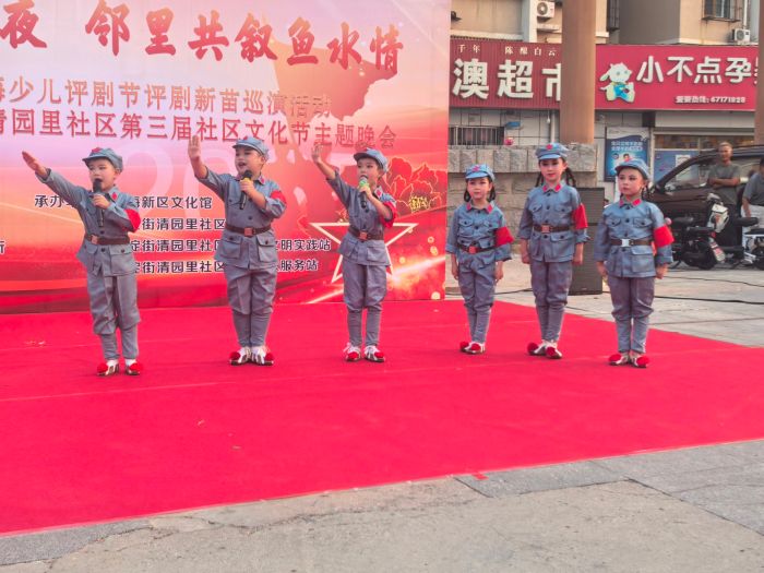 津滨网讯(记者 周华婷 报道 张鹏 摄影)军歌嘹亮,唱响峥嵘岁月。童声清越,传承红色基因。8月1日晚,茶淀街道清园里社区文化广场华灯璀璨,座无虚席,“八一军旗映夏夜,邻里共叙鱼水情”天津市第十一届滨海少儿评剧节新苗巡演活动暨茶淀街道清园里社区第三届社区文化节演出在这里温情上演。居民们与受邀前来的退役军人欢聚一堂,在滨海新区文化馆少儿评剧传习班孩子们演绎的红色经典中,同庆建军佳节,共话军民深情。