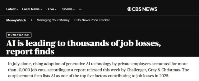 美国哥伦比亚广播公司刊发的一篇报道认为,人工智能(AI)技术已成为美国企业今年岗位流失的五大主因之一。报道说,自2023年以来,超2.7万个岗位直接因AI兴起被取代,仅今年7月,美国私营企业因加速采用AI技术,已裁撤超1万个工作岗位。